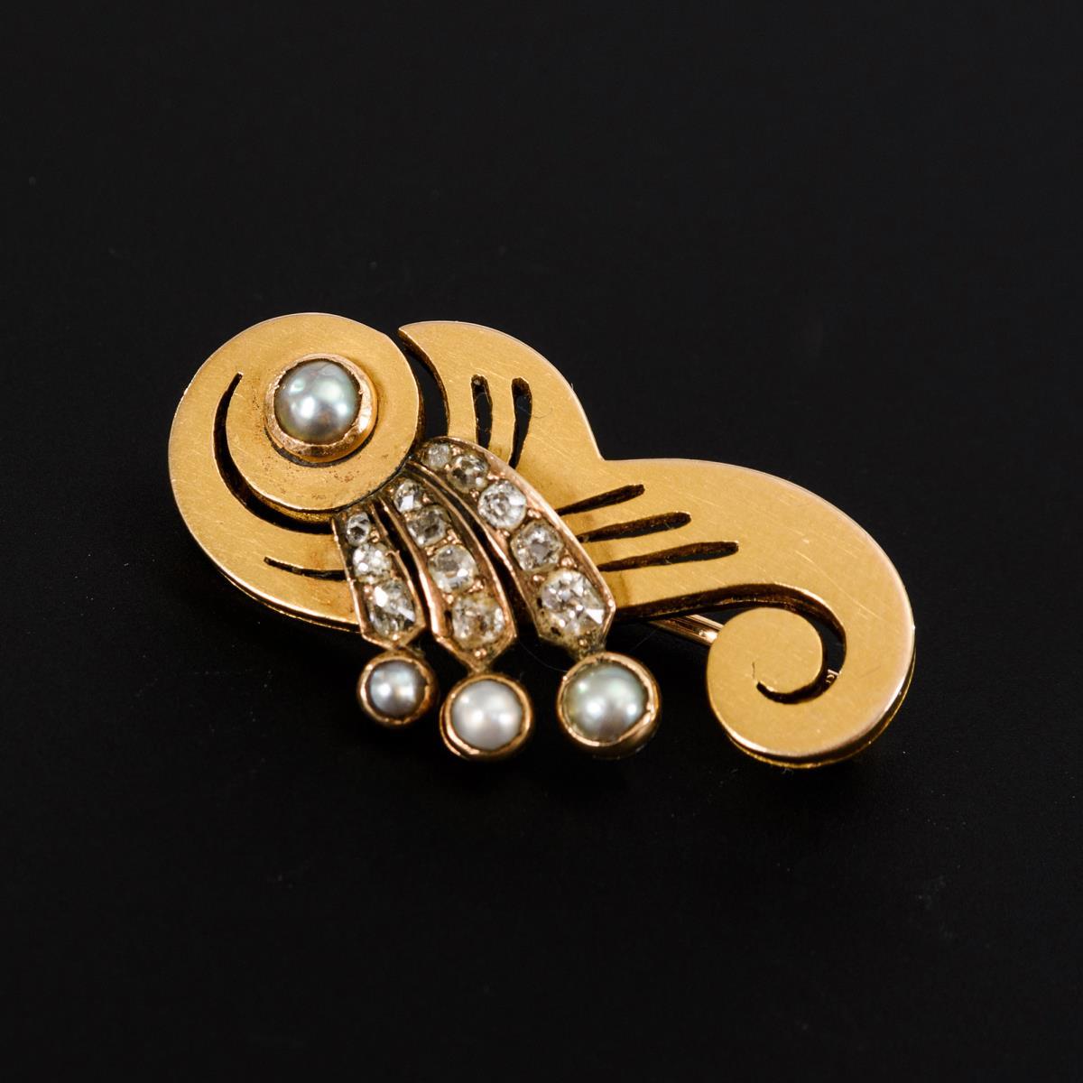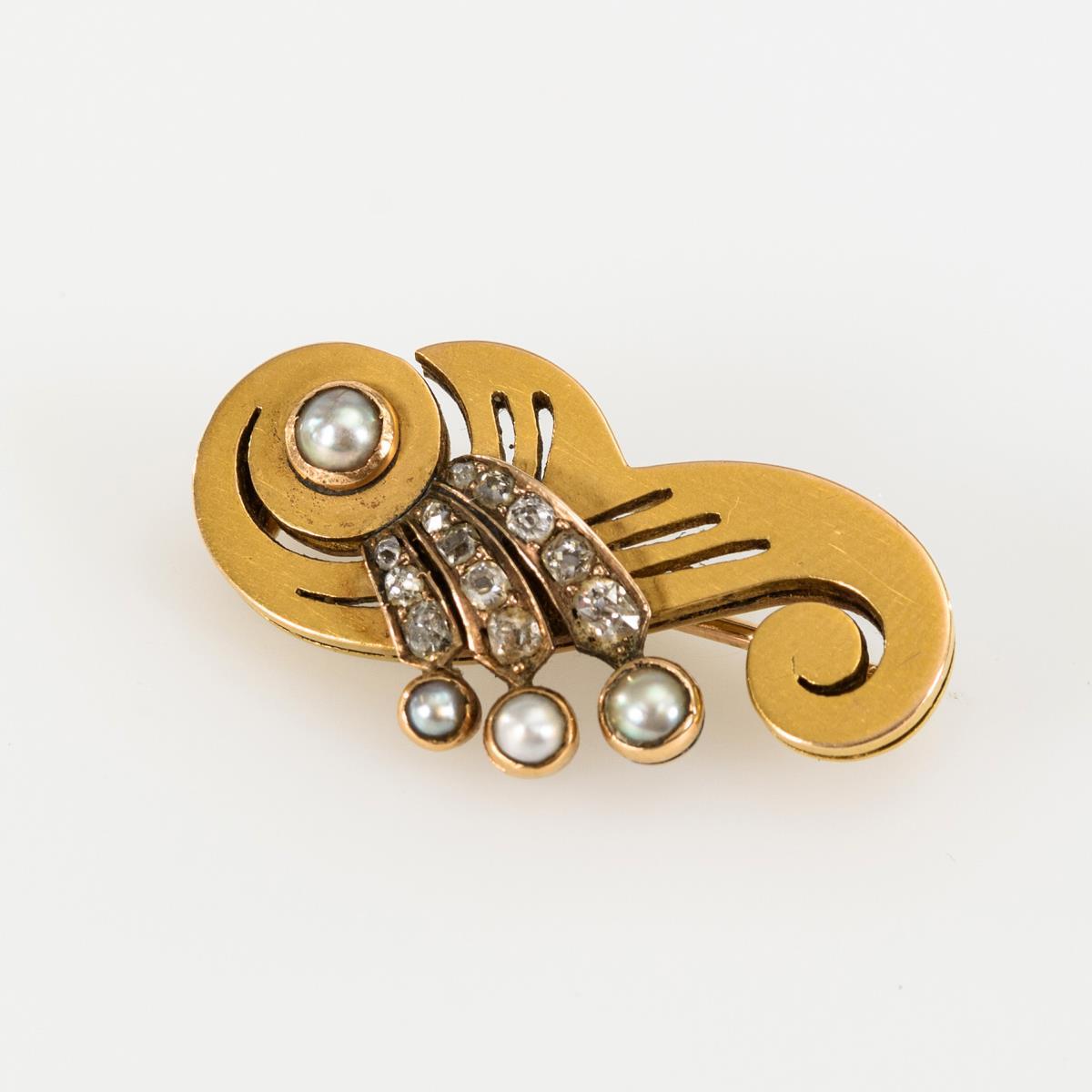 Russische Brosche mit Altschliff-Diamanten und Halbperlchen.