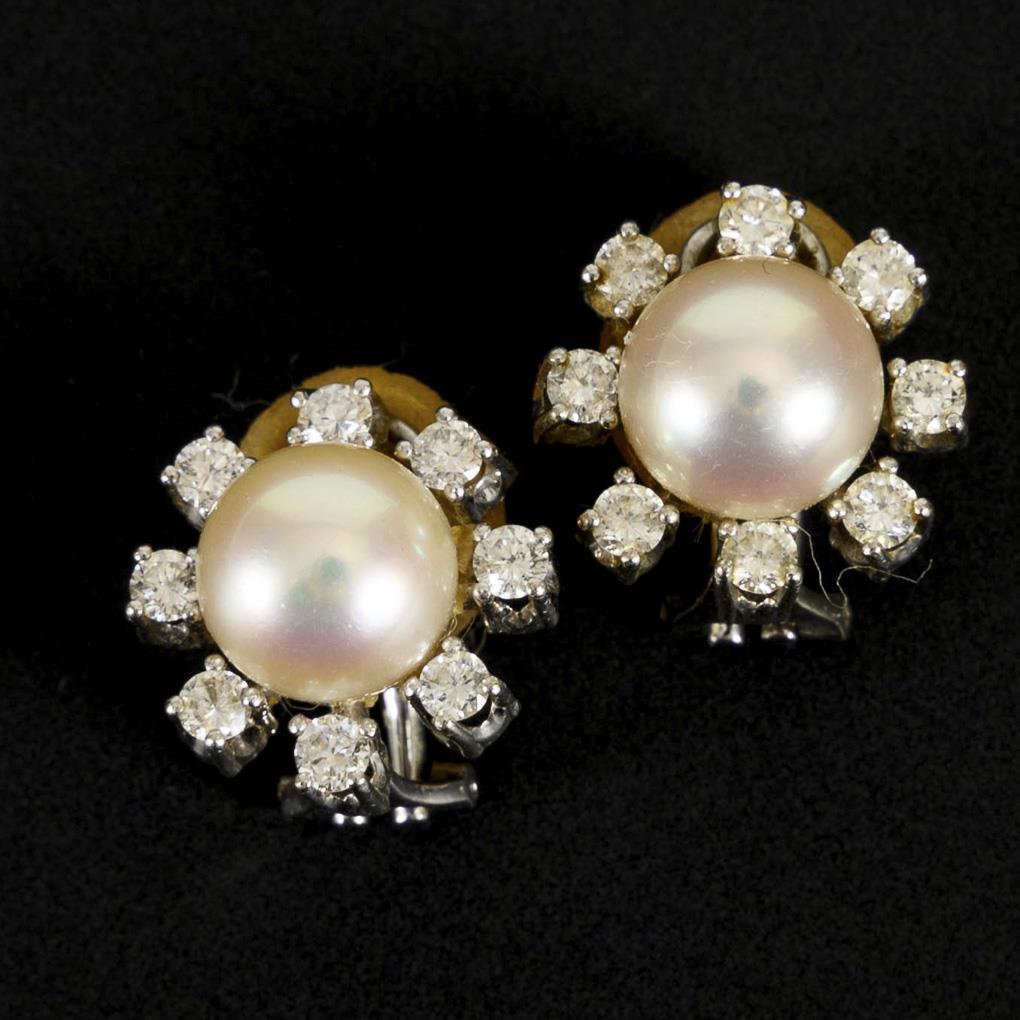 Cultured pearl, each surrounded by 8 small, chaton-set brilliant-cut diamonds. Clip mechanism.