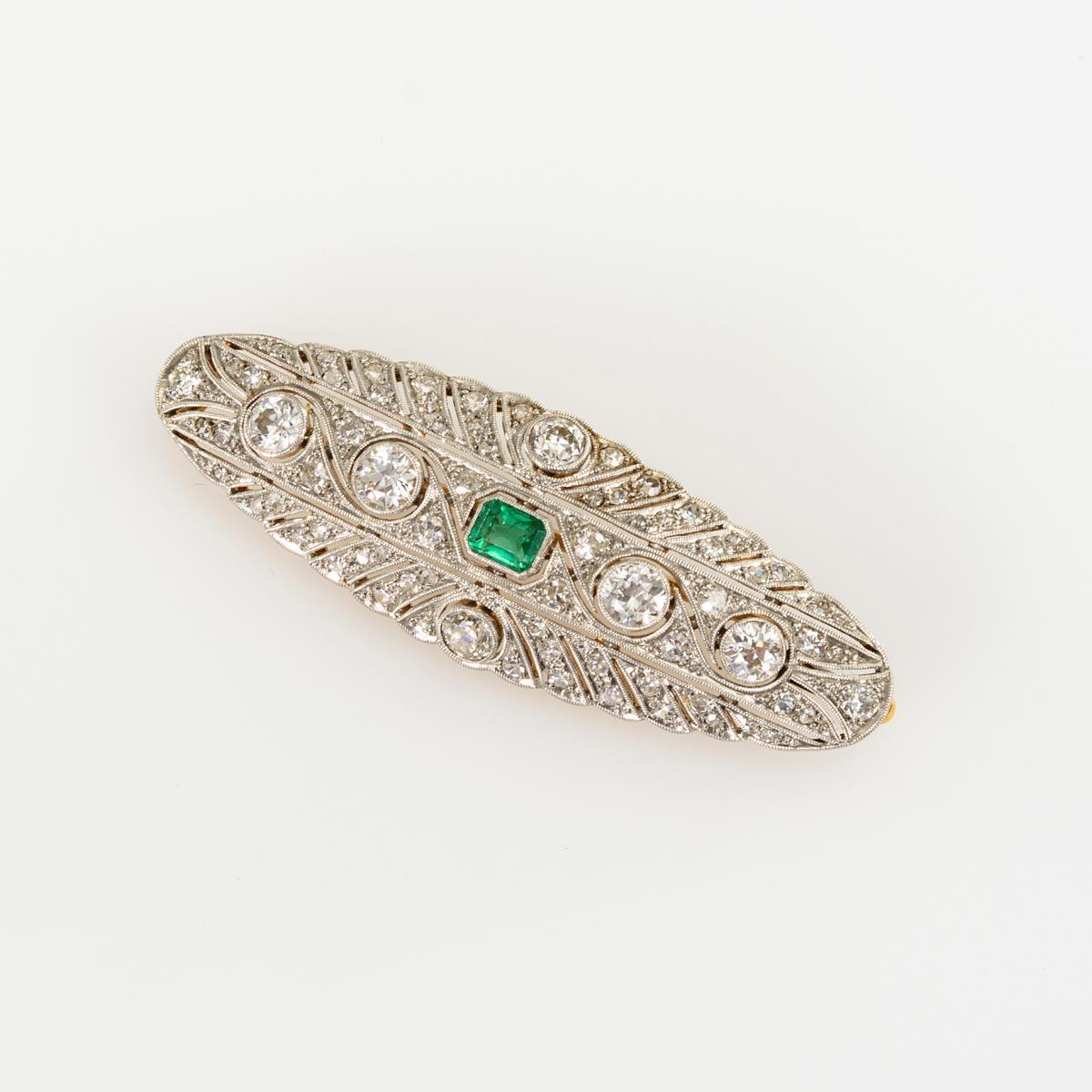 Art-déco-Brosche mit Altschliff-Brillanten, Diamanten und Smaragd .
