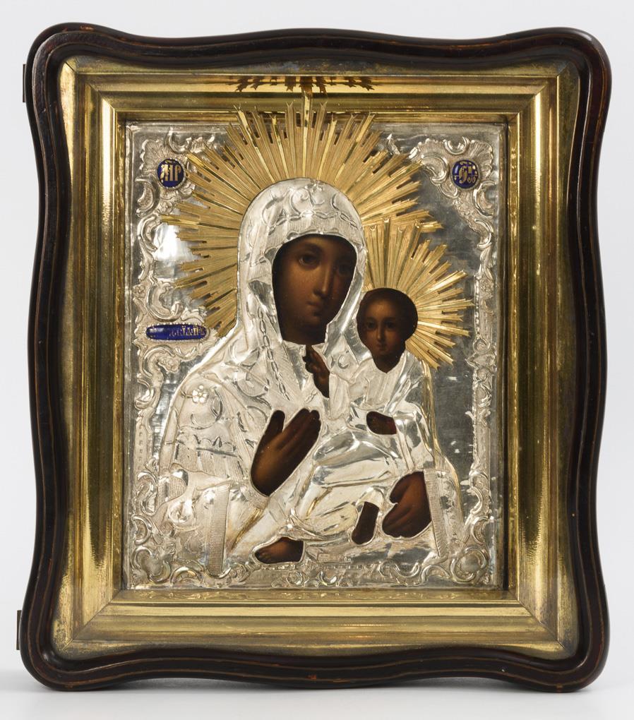 Either tempera/wood, silver oklad, 84 zolotniki. Russia. 19th century