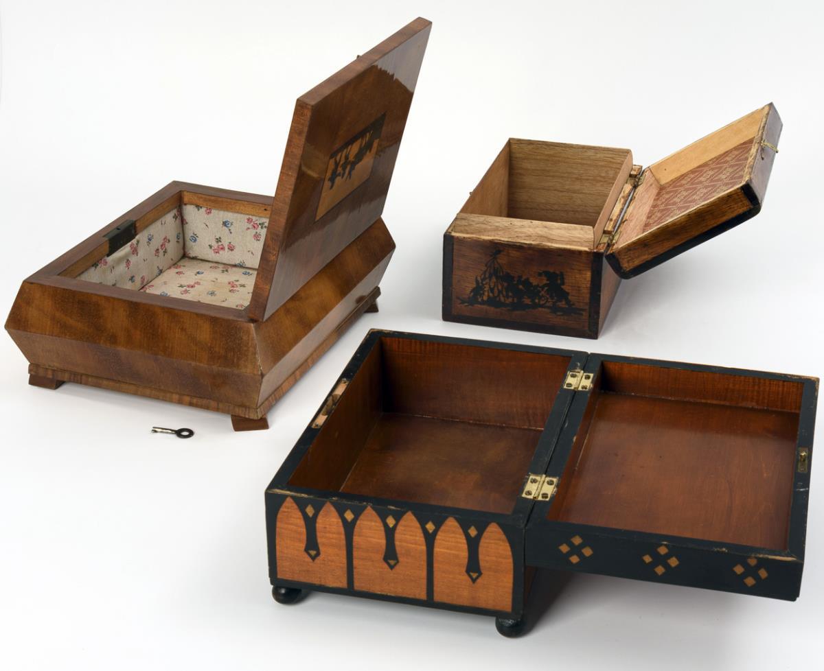 Various light woods veneered/marquetry, partly stained/ebonized, inside partly lined with fabric or wallpaper. Maximum size 11 x 27 x 23 cm.