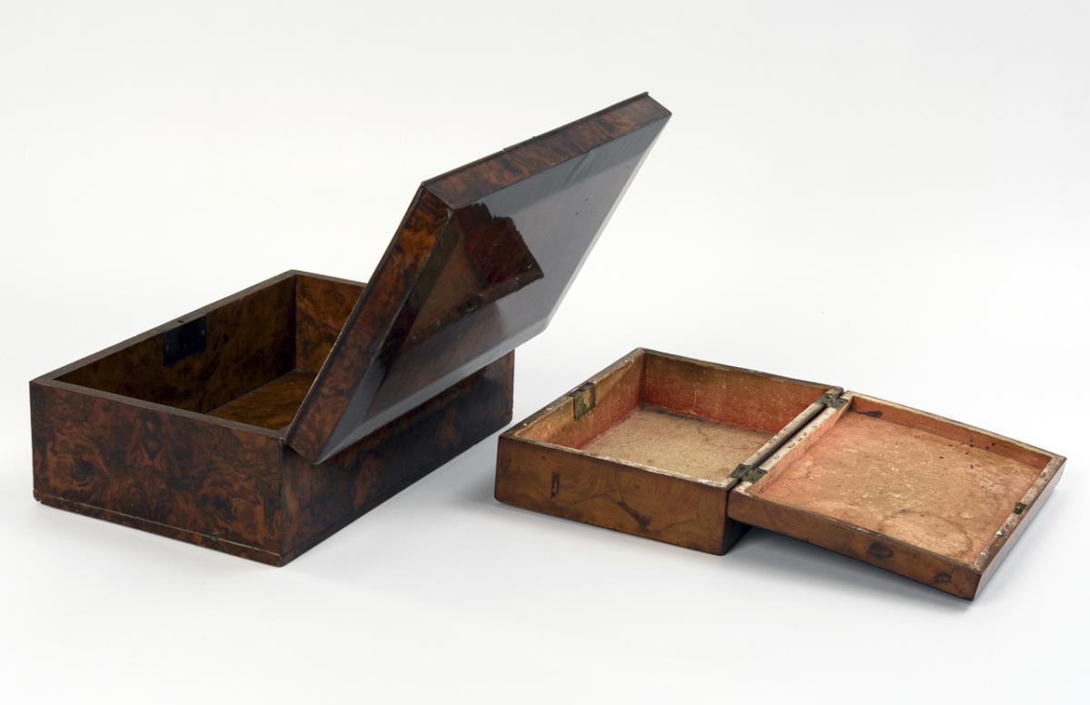 Burlwood partly dark, partly stained slightly greenish, 1x mirror glass, partly papered. Maximum size 12 x 32.5 x 21 cm.