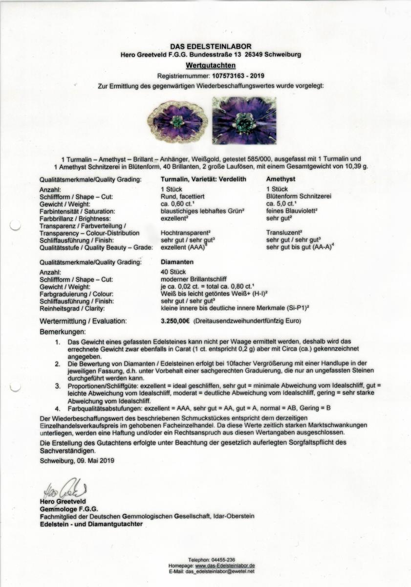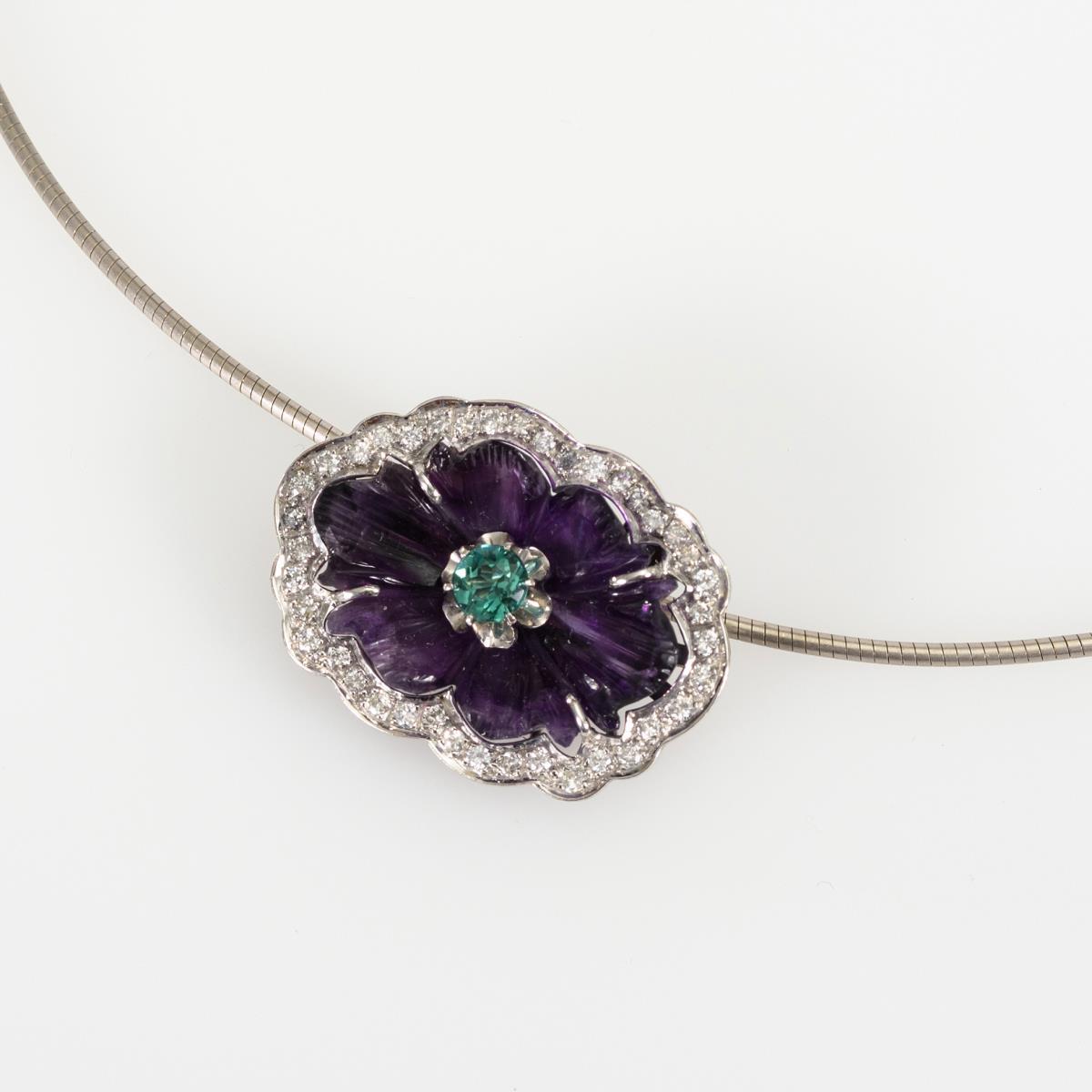 Amethyst ca. 5,0 ct, Turmalin ca. 0,60 ct, Brillanten zus. ca. 0,80 ct/H-I/si-PI. Anhänger 3,5 x 2,5 cm.Kette L 43 cm.