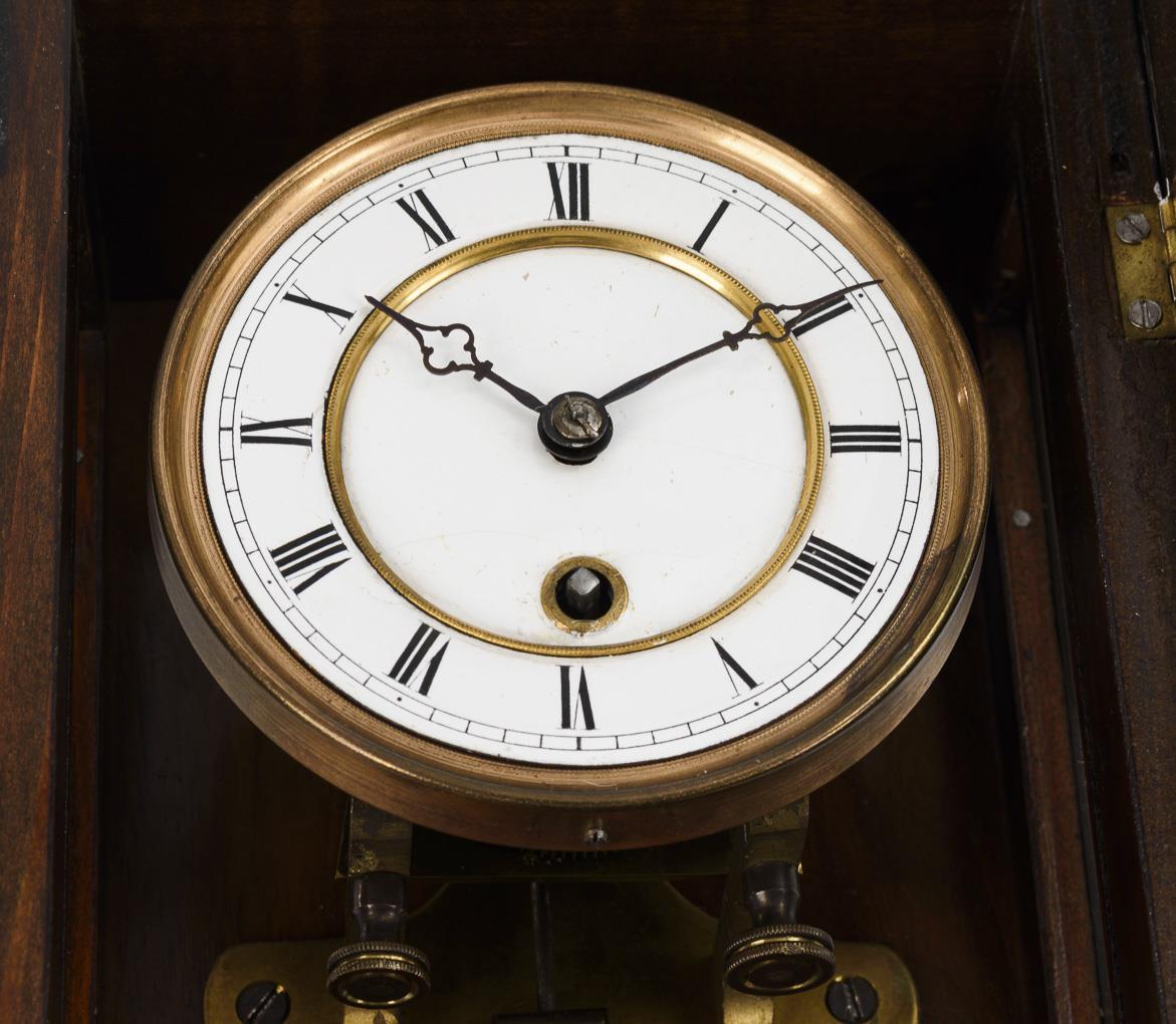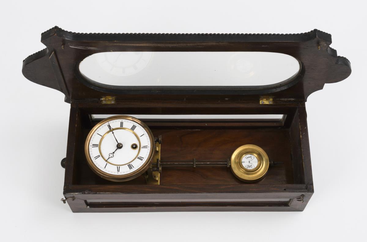 Wall clock with curved and laterally glazed case, front door with beaded edge, rosette decoration and oval glazing. Slight signs of age, dial hairline cracked and with retouches.