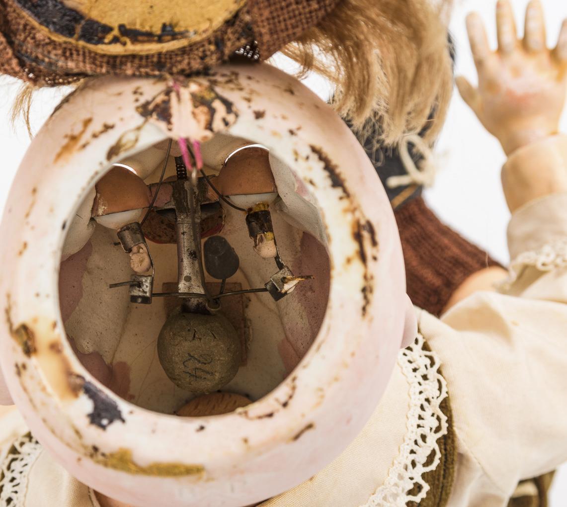 Cranked head, blue sleeping/shelmet eyes, dark blond mohair wig. 7-piece sitting baby body. White blouse, short brown leather trousers, black shoes. Head x-rayed: without defects, 1 toe minimally bumped.