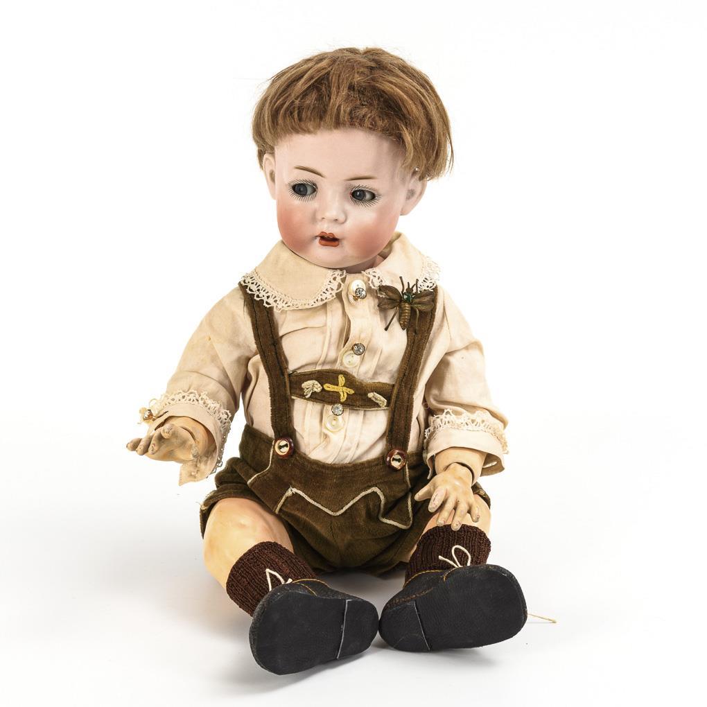 Cranked head, blue sleeping/shelmet eyes, dark blond mohair wig. 7-piece sitting baby body. White blouse, short brown leather trousers, black shoes. Head x-rayed: without defects, 1 toe minimally bumped.
