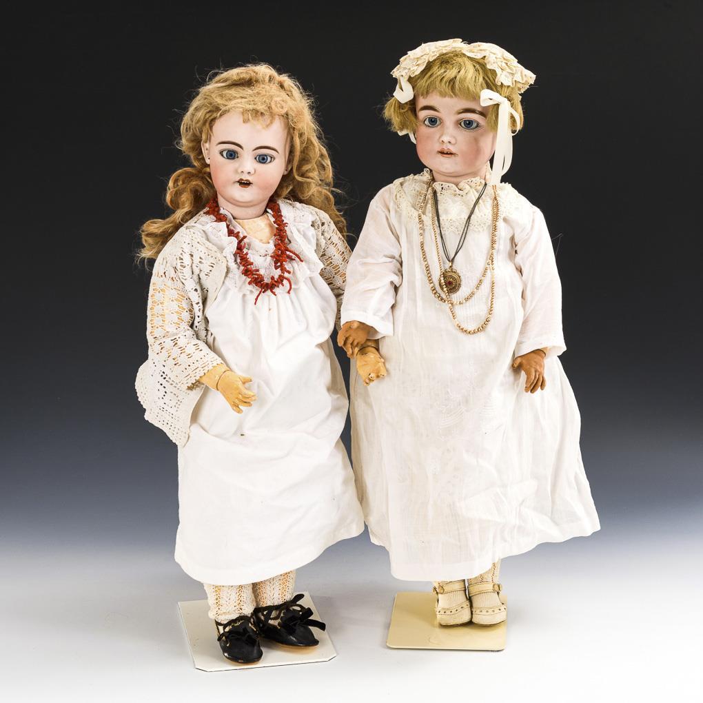 Both with cranked heads, blue eyes, blonde wig, multi-part jointed body and white dress. Kestner girl with plastered sleeping eyes and slightly brittle rubber hands. S & H doll with defective mechanics in the body, 1 finger glued. Heads x-rayed: without defects.