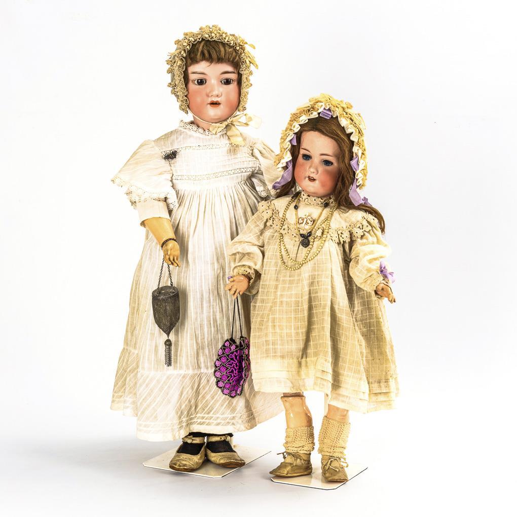 Both with crank head, sleeping eyes, light brown wig, multi-part jointed body, light dress, hood and white shoes. Heads x-rayed: without defects (1x teeth chipped). Both with paint defects or overpainting (1x hand with repair and missing finger).