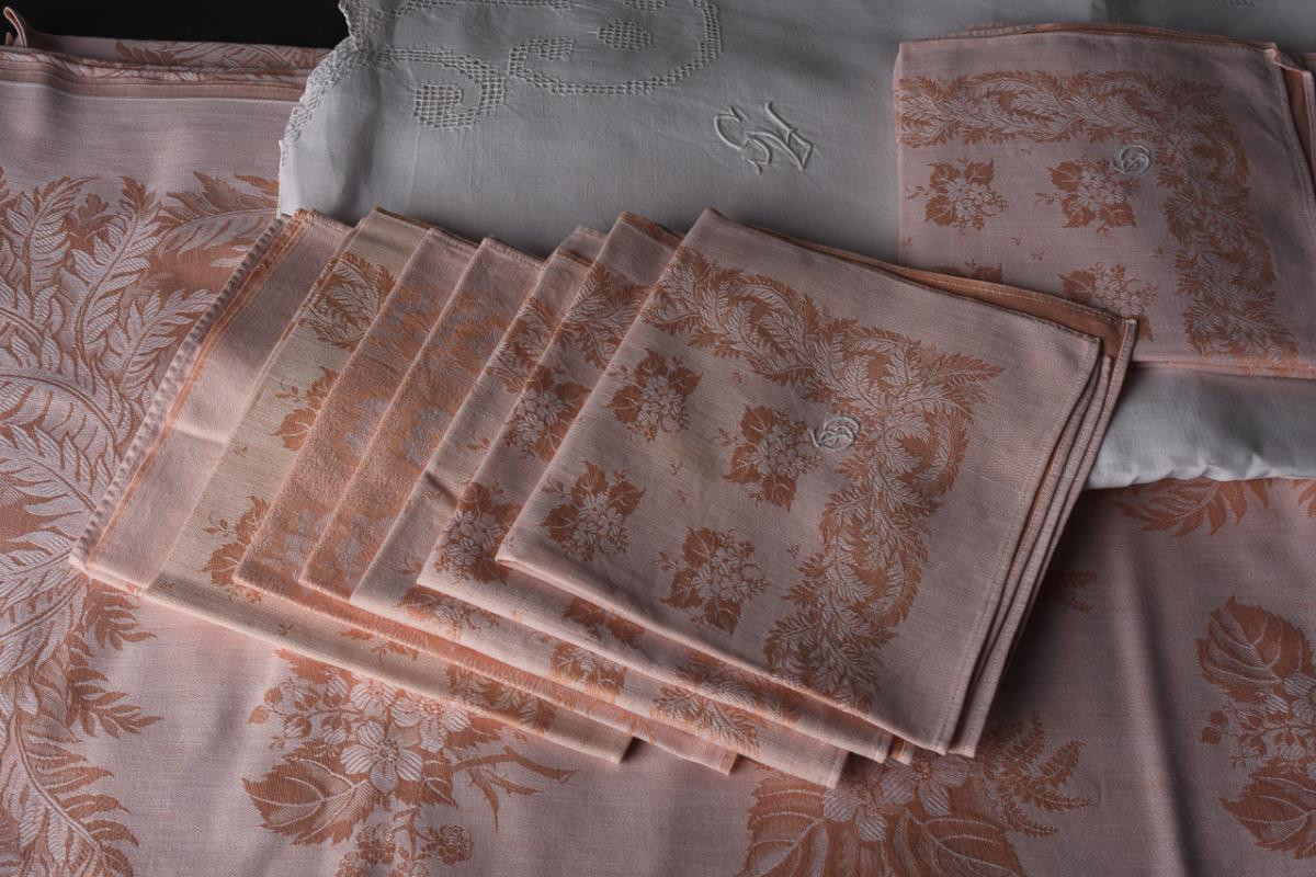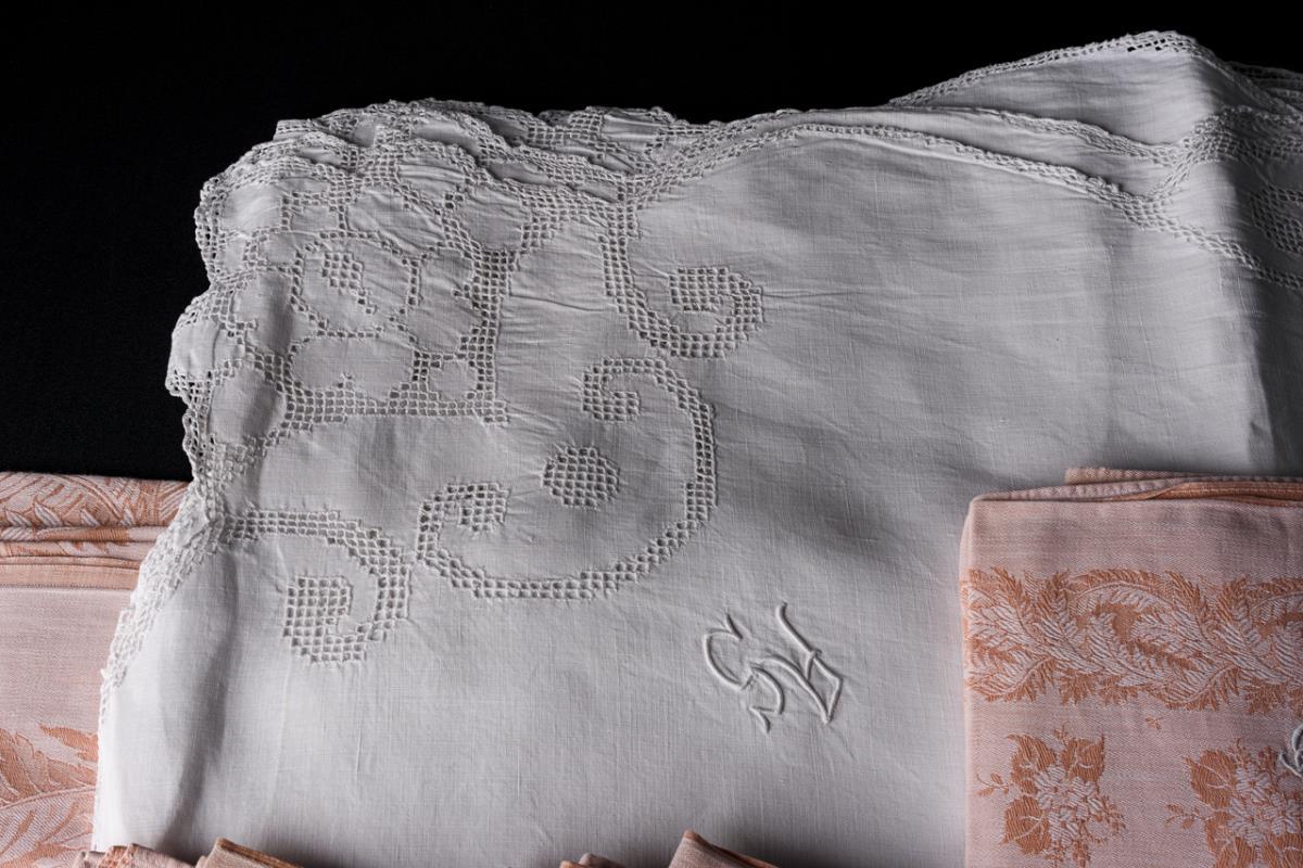 White tablecloth with eyelet embroidery on the scalloped edge, wide oval in the center with combined eyelet embroidery and satin embroidery: ornament with cartouches of people (archer and cornucopia bearer) and embroidered monogram "AS". / Salmon-colored tablecloth and napkins with fern border and two-dimensional floral repeat, each with embroidered monogram "GDL"(?). 1x minimally stained.