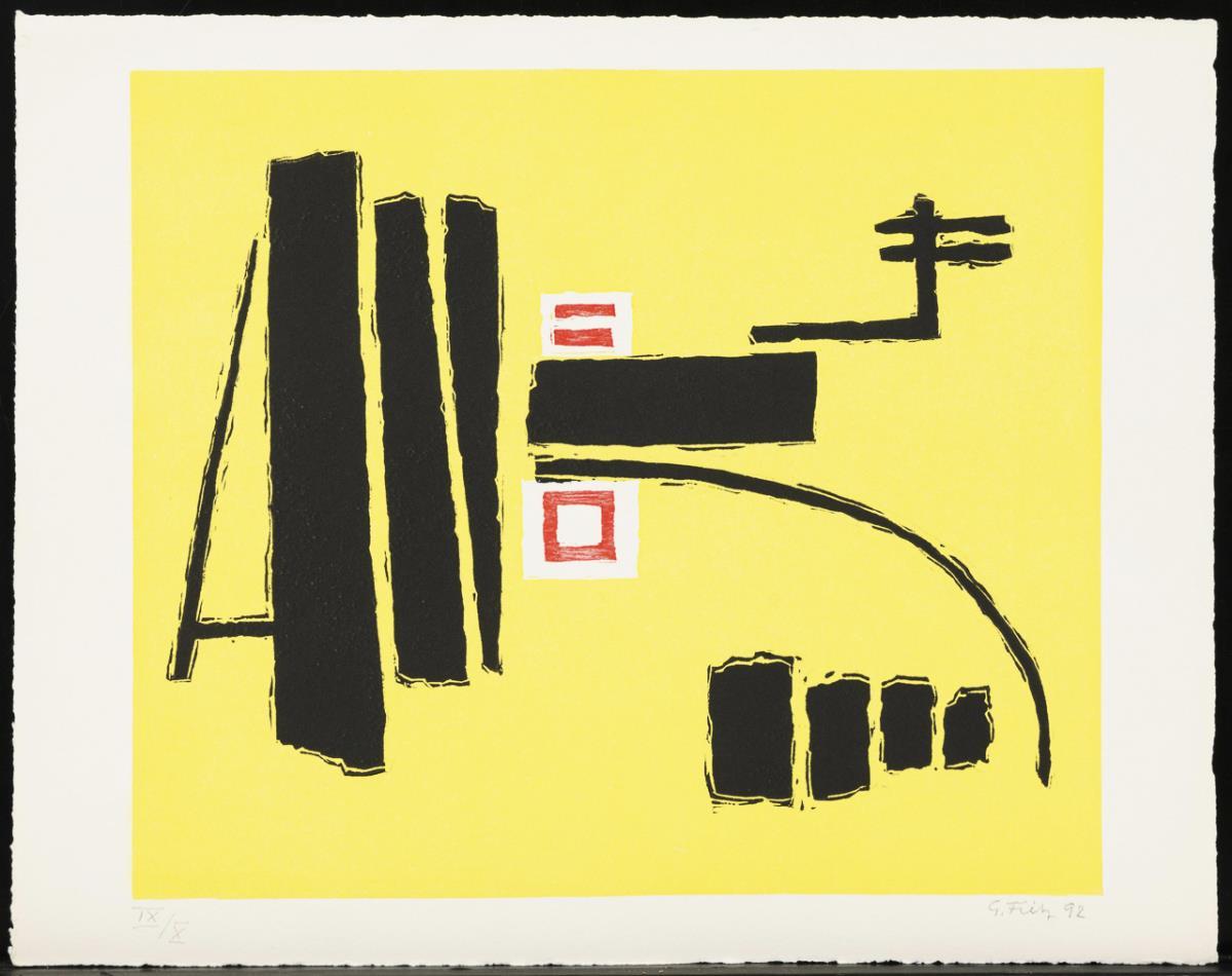 Abstract composition on yellow ground: printing block: 34.5 x 40 cm, copy: IX/X, 1992 for the Fritz Winter Haus | Abstract composition on orange ground: printing block: 31.5 x 40 cm, copy: 12/50, [19]93; both works with handwritten dedication on verso.