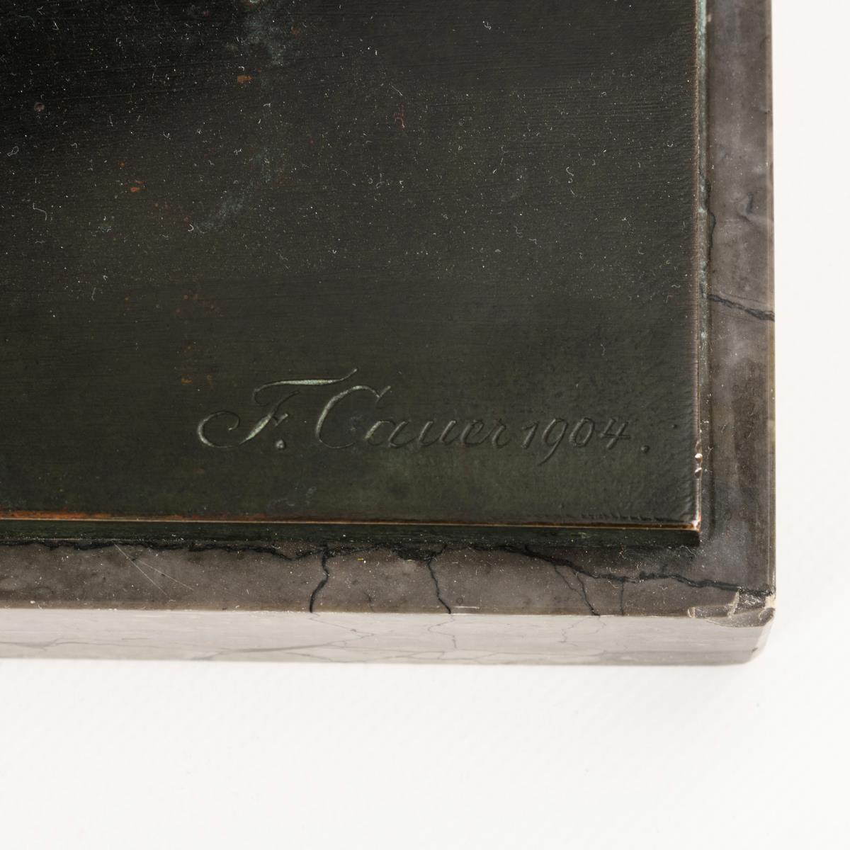 Kupfer-Galvanoplastik dunkelbraun mit grünem Schimmer patiniert, dunkelgraue Marmor-Plinthe.