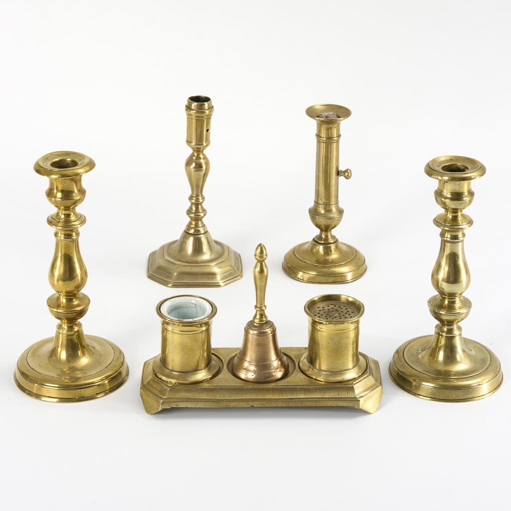 4 candlesticks and 1 writing utensil.