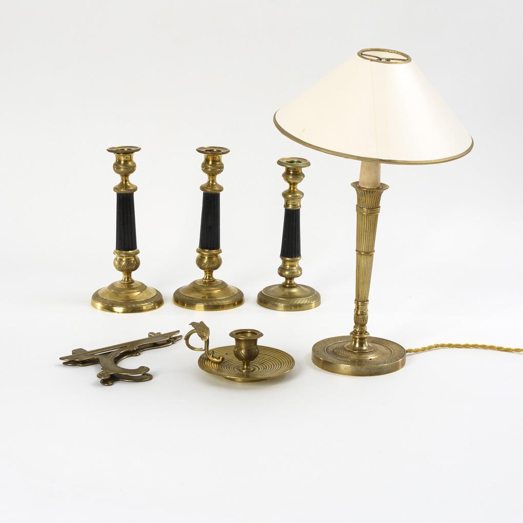 Pair of early Biedermeier bronze chandeliers and similar single chandelier with fine relief friezes and fluted column shaft made of black sheet brass. / Empire-style chandelier with fine relief friezes and fluted conical shaft. Subsequently converted into a lamp with waxed cardboard candle holder on a single-flame screw socket and white plastic shade / 1 night light / 1 hinged stand in the Art Nouveau style. Lamp has loose contact.