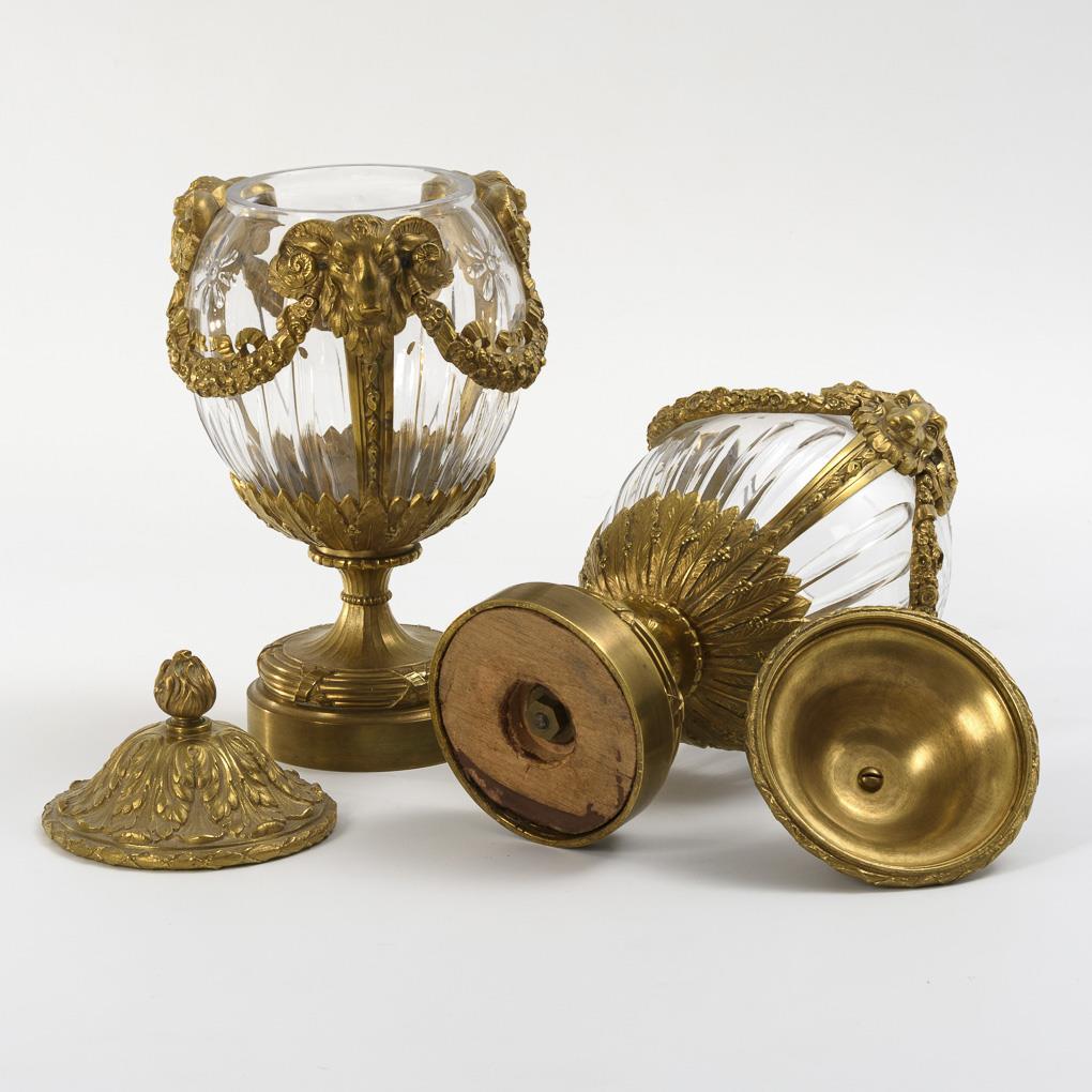 Ovoid bonbonnière with decorated bronze foot, glass body with cut throats and rosettes, mounting with lancet leaves and garlands between the aigicrania; the bronze lid with acanthus relief and knob. Minimal chips to one edge of the glass.