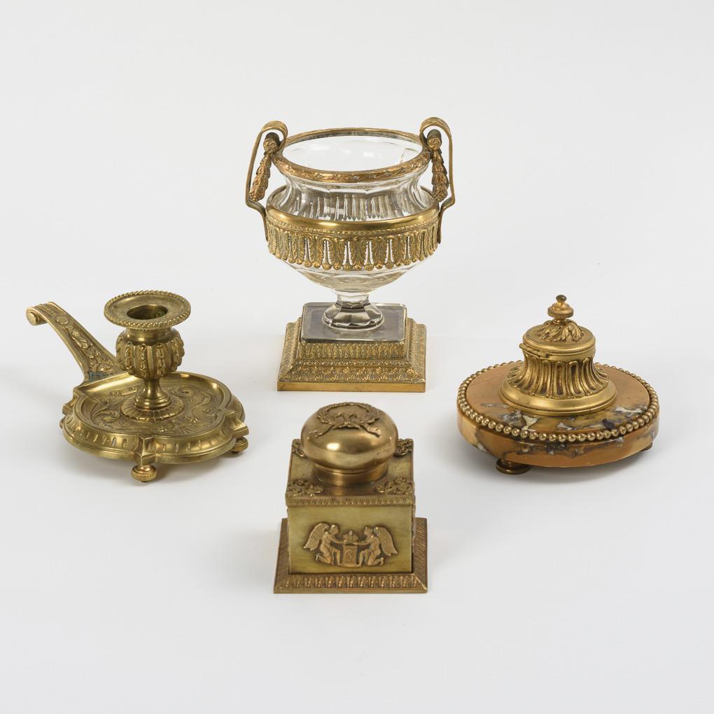 Faceted cut, bowl-shaped glass vase with fine friezes on the antique brass mount / Massive hand candlestick with carrying handle and late Baroque relief decoration / Cube-shaped inkwell with fine leaf friezes and relief appliqués on each side: 2x a pair of angels holding the imperial crown above the pedestal with Napoleon monogram and 2x a hippocamp. On the hinged lid an applied oak laurel wreath, below a glass bowl / Inkwell with round marble base and decorated bronze vessel with hinged lid, below a glass bowl.