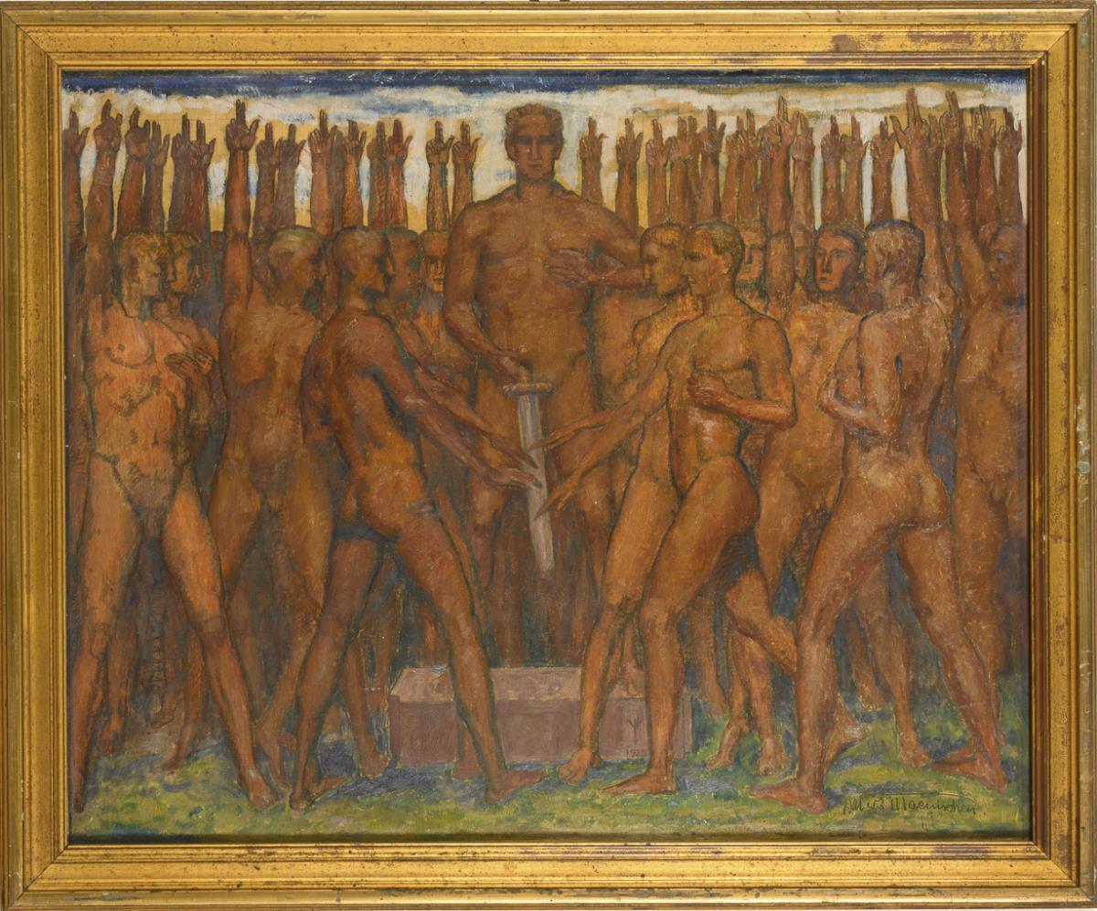 Many naked men take an oath at the sculpture of a man standing with a sword.