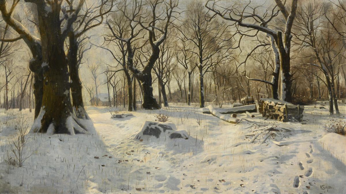Snowy landscape painted in the manner of Mønsted with warm sunlight on the snow and the bare trees near a village.