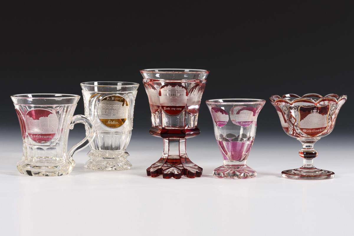 2 goblets and 1 sugar bowl with red stain and inscribed views of Teplitz and Baden (h 2x 14 cm, 1x 11 cm). / 1 mug partly stained purple with views of Wiesbaden (h 10.5 cm). / 1 partly purple stained crater mug with views of Wiesbaden (H 10.5 cm). Each with minimal knocks to foot or rim.