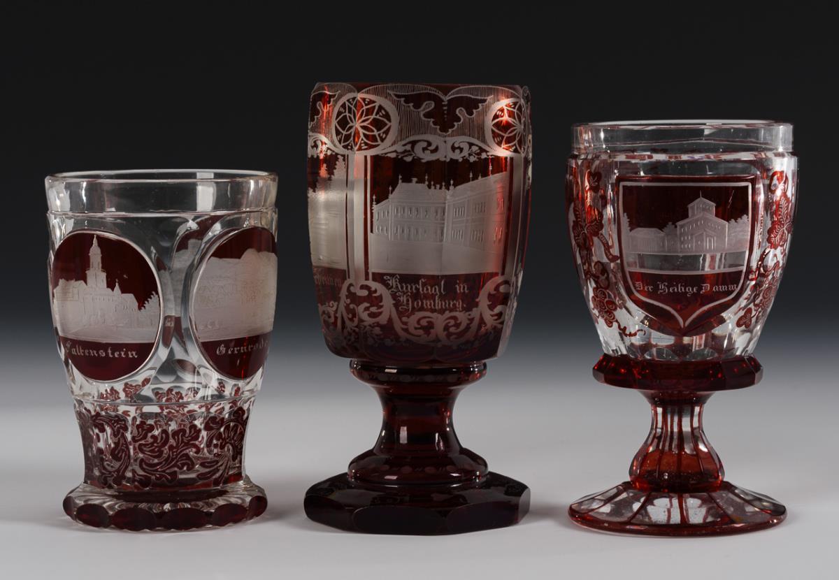 4 goblets and 1 footed beaker with engraved views (including Salzbrunn, Ballenstedt, Gernrode, Altwasser). 1x rim chipped, 2x chips to foot rim.