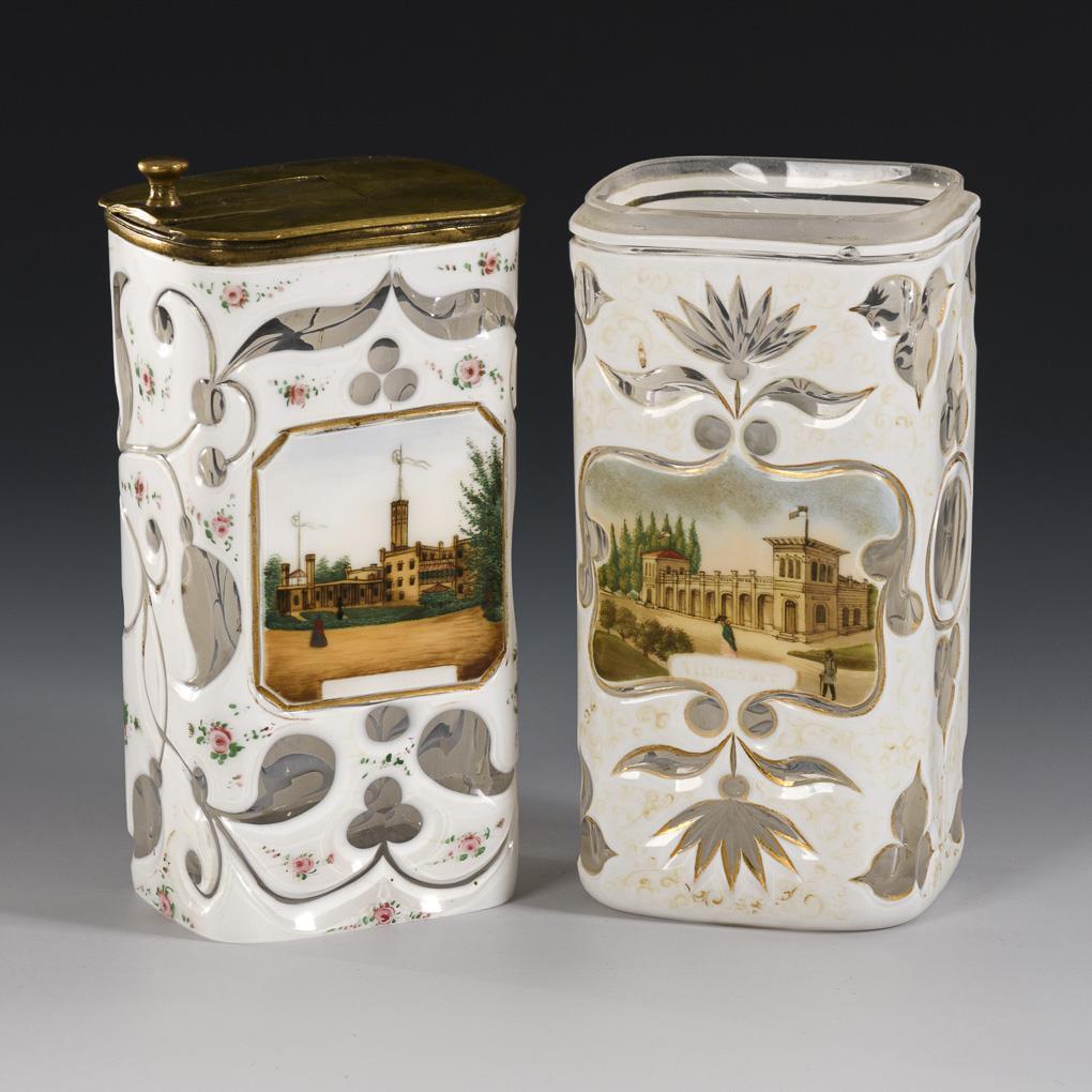 Rectangular jars with lentil and notched decoration and 1x metal mount with sliding catch. Each with a rectangular cartouche on the front with the inscribed view of Erdmannsdorf Castle and the Elisenhalle in Salzbrunn in Silesia. Painting by Franz Julius Krause (1824-1891). 1 metal mount missing, 1x with edge bump, 1x with small bump on the stand, gold rubbed.