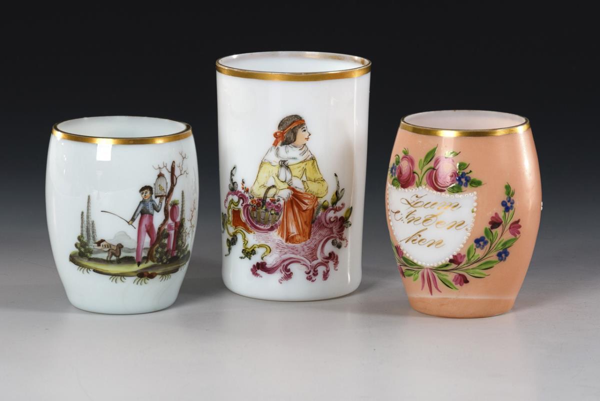 1x mug with skin-colored ground and the inscription "Zum Andenken". / 1x mug with a depiction of a young man with a birdcage and dog in a landscape on the front / 1x cylinder mug with a depiction of a gardener with a basket of flowers above a rocaille. Partial gold wear, 2x with small rim chips.