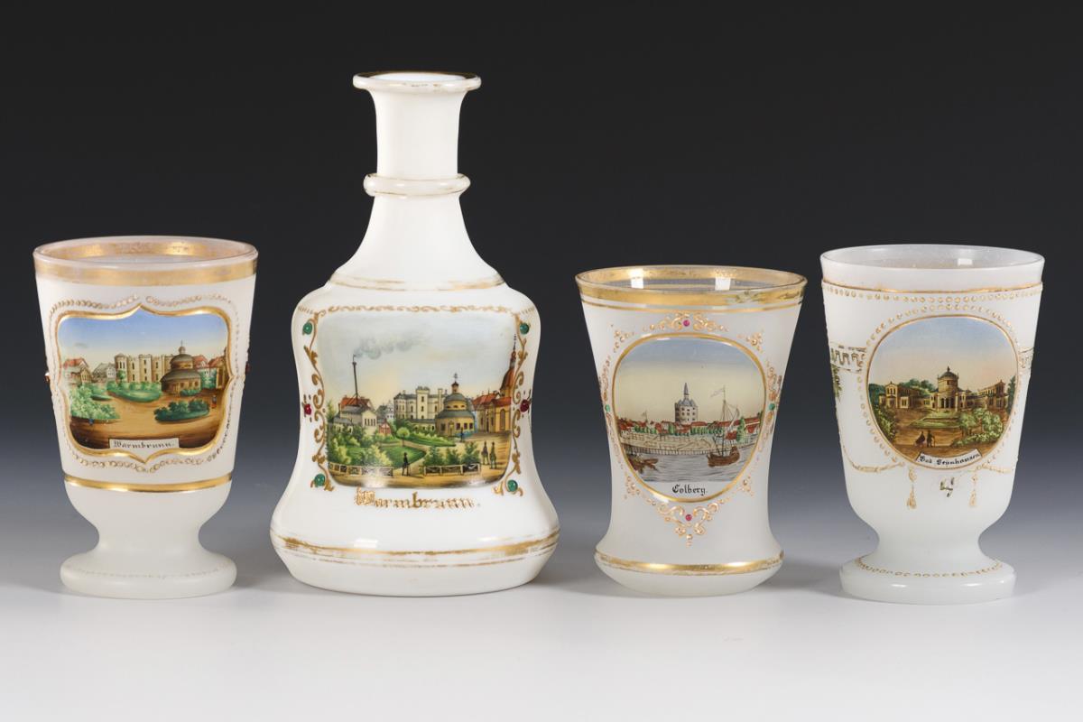 1x white milk glass: carafe with a view of Warmbrunn on the front (without stopper; h 19 cm). / 3x white alabaster glass: 1 beaker and 2 goblets with the views of Bad Oeynhausen, Warmbrunn and Colberg. All with relief gold painting and applied colorful glass cabochons. Painting probably by Joseph Hauptmann or Joseph Hauptmann workshop ( H 11.5-12.5 cm). Gold partly rubbed, 1 goblet with 2 chips to the base on the underside.