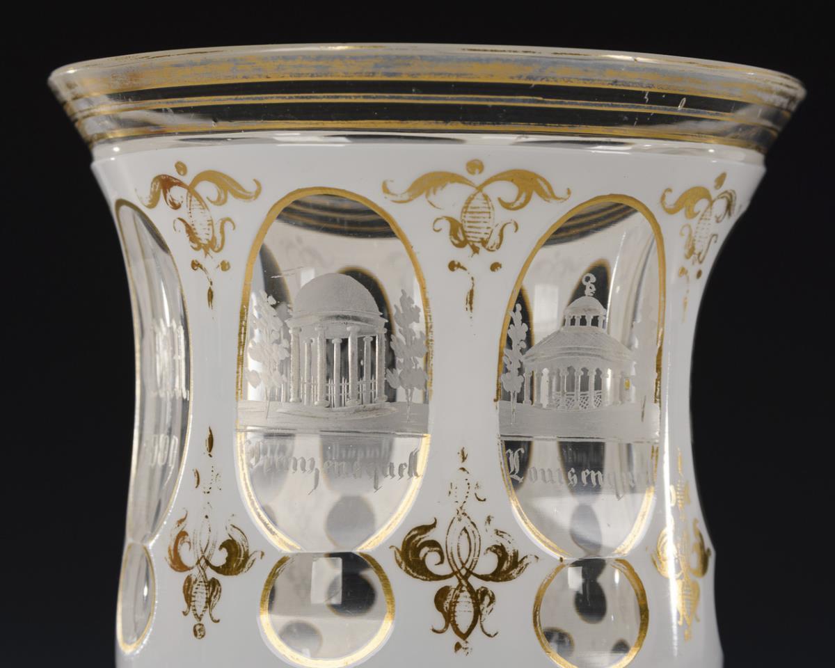 2 beakers of colorless glass with white overlay, 1x with engraved views and the inscription "E.M. 1869". / 1 beaker of colorless glass with pink overlay. All with lentil and olive cut decoration. Gold decoration rubbed.