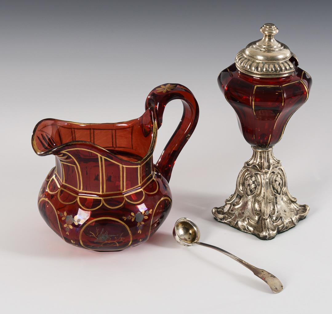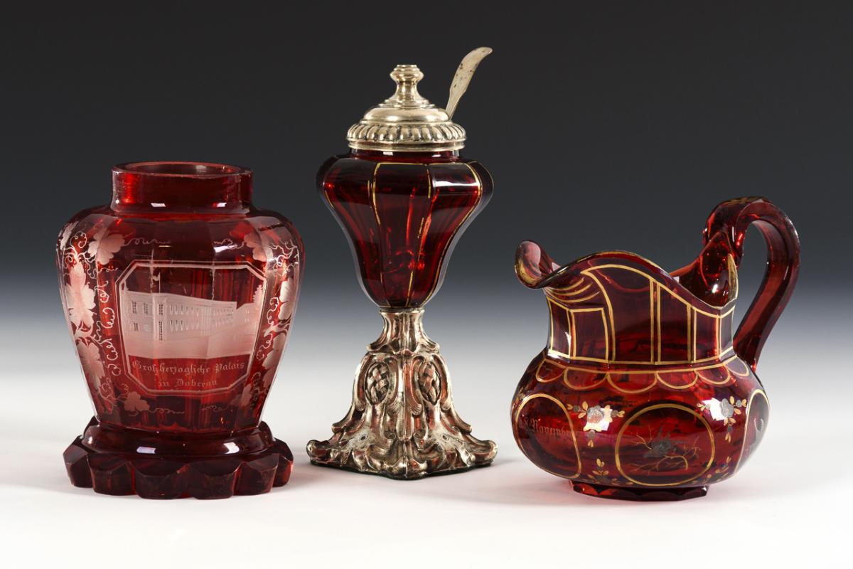 Biedermeier milk jug with gold and silver painting and the inscription "d. November 8, 1846" (h 12 cm). / Faceted baluster flask with multi-pass foot and engraved views of Bad Doberan (without stopper; h 13 cm). / Mustard jar with faceted and gold-decorated baluster body and silver-plated metal foot, with spoon (h 16.5 cm). Gold rubbed, rim and foot of the flacon with small chips.