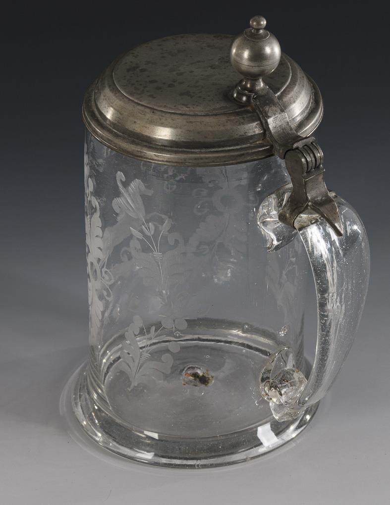 Cylindrical jug with strap handle and pewter-mounted hinged lid; chipped. On the wall the engraved motif of a jumping horse under the slogan "freyheit mit furcht", framed by flowering branches.