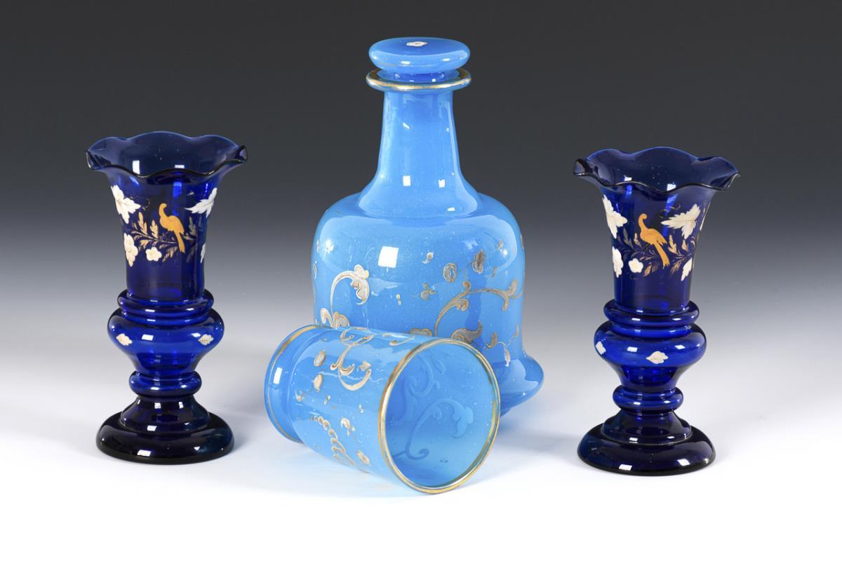 2x cobalt blue glass vases with bird and vine painting (H 16 cm). / 1x carafe (H 20 cm) with stopper and beaker (H 11 cm) made of light blue alabaster glass with vegetal gold painting. Partial minimal gold abrasion.