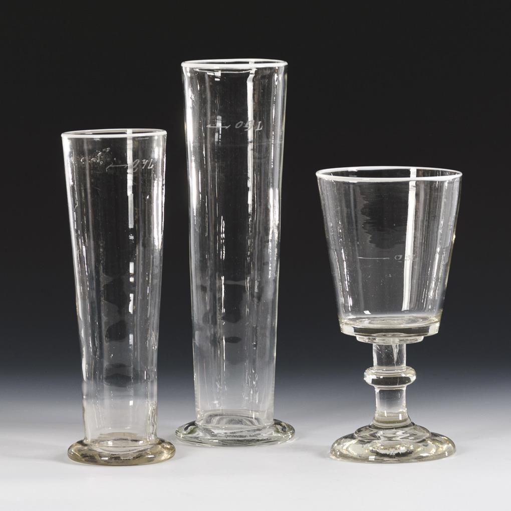 Colorless, slightly streaky glass, pewter enamel; mainly with chipping. 2 beer steins (h 26.5 and 31.5 cm), 1 goblet (h 23 cm).