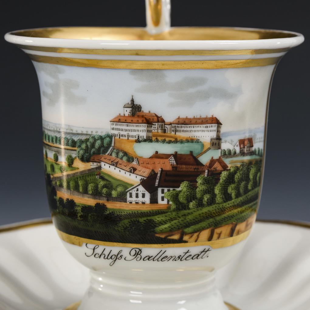 Footed bell-shaped cup with griffin-head handle. On the front a gold-framed rectangular cartouche with the inscribed view of Ballenstedt Castle in the Harz Mountains. Below a firing crack at the foot of the cup.