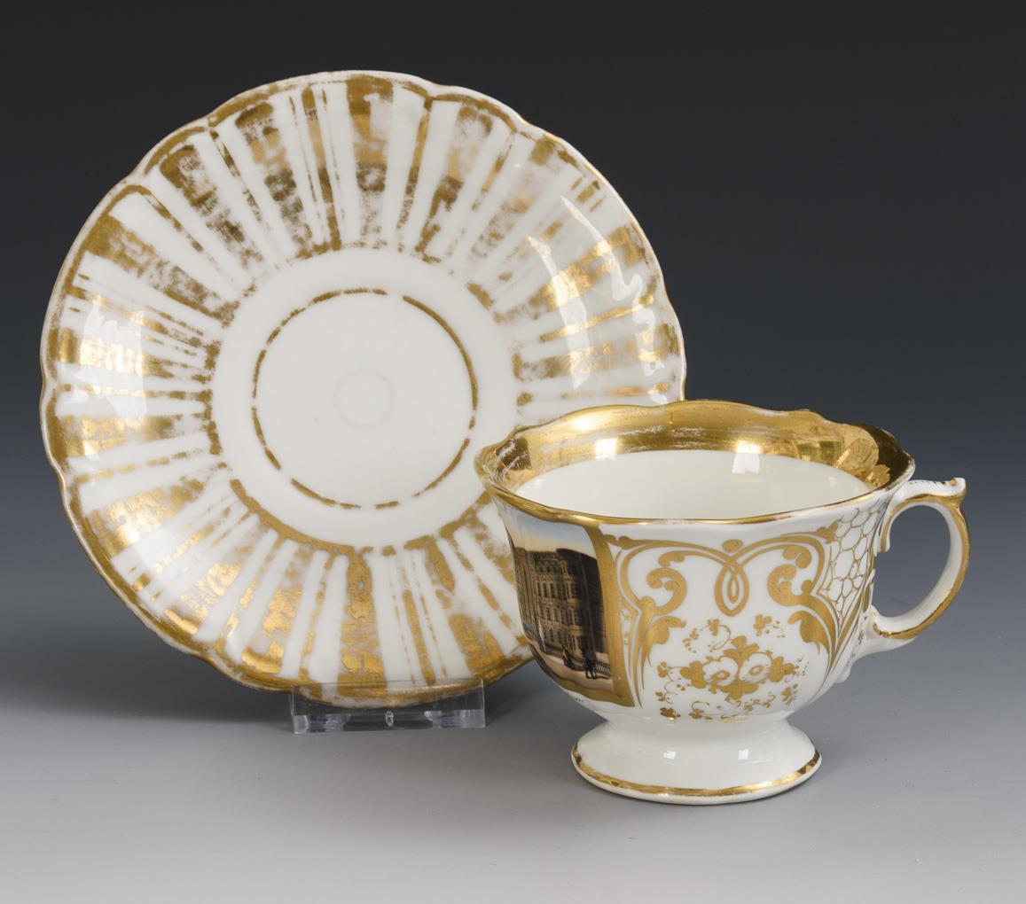 Footed, fitted bell-shaped cup with rocaille handle. On the front a gold-framed rectangular cartouche with the inscribed view of the palace in Berlin. Partial gold abrasion.