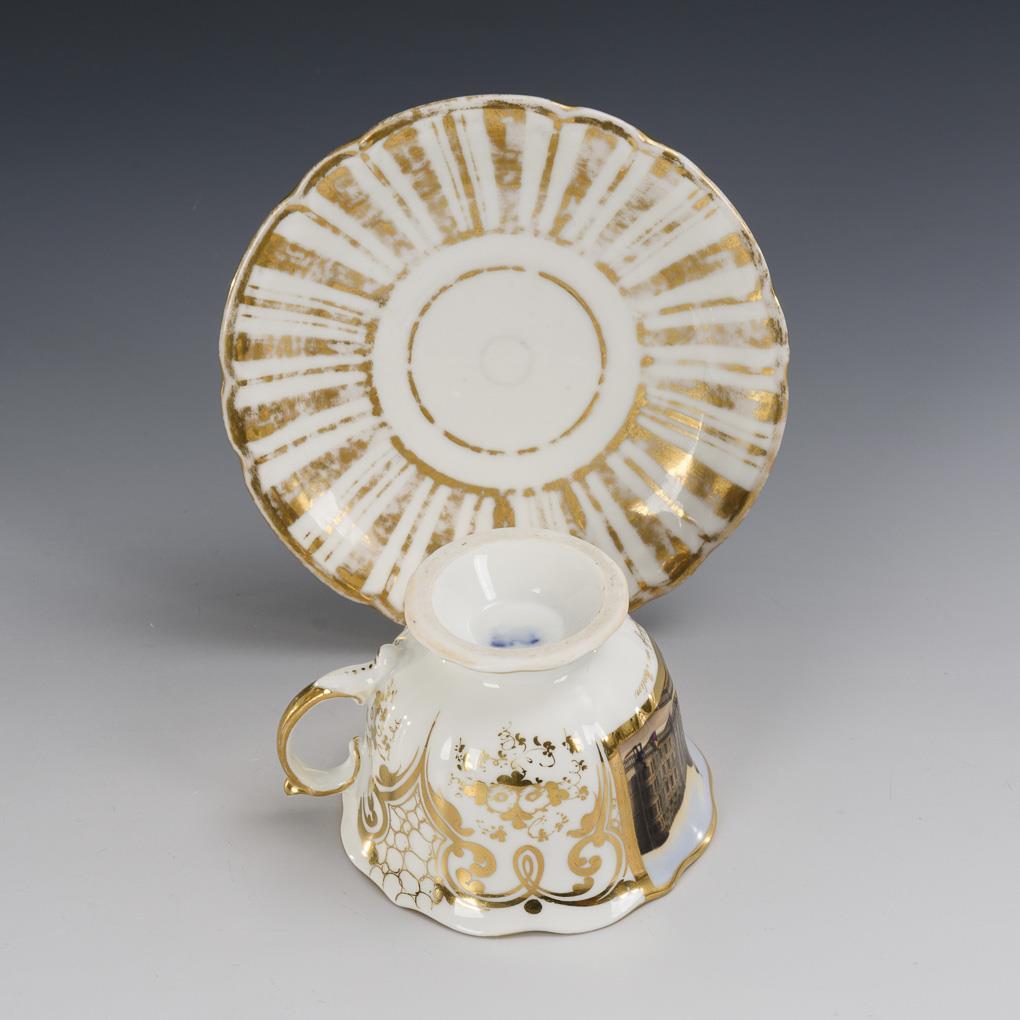 Polychrome painted, decorated in gold. Cup (H 7 cm), completed saucer (Ø 14 cm).