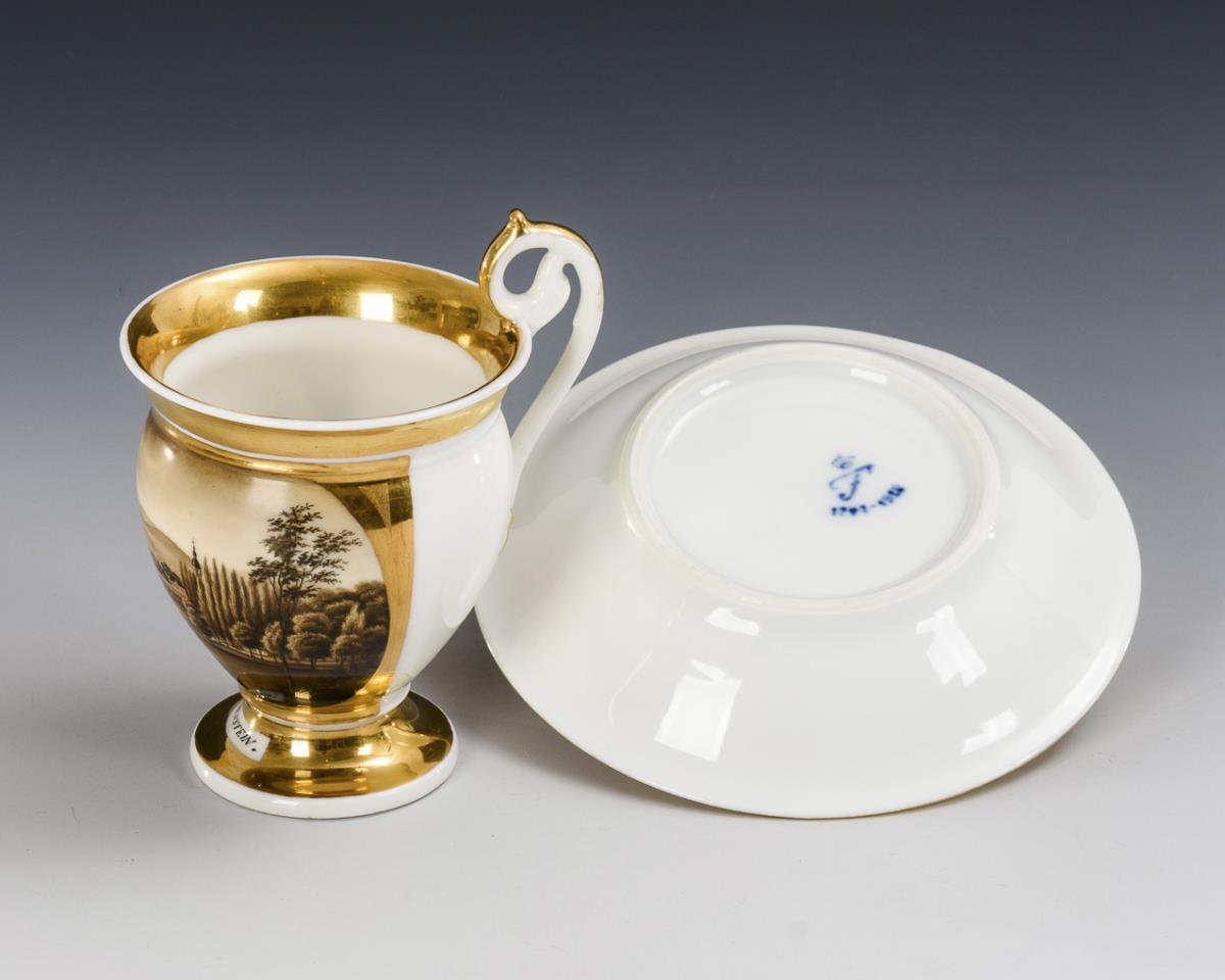 Sepia painting, gold decoration. Cup (h 11.5 cm), completed saucer (Ø 13.5 cm).