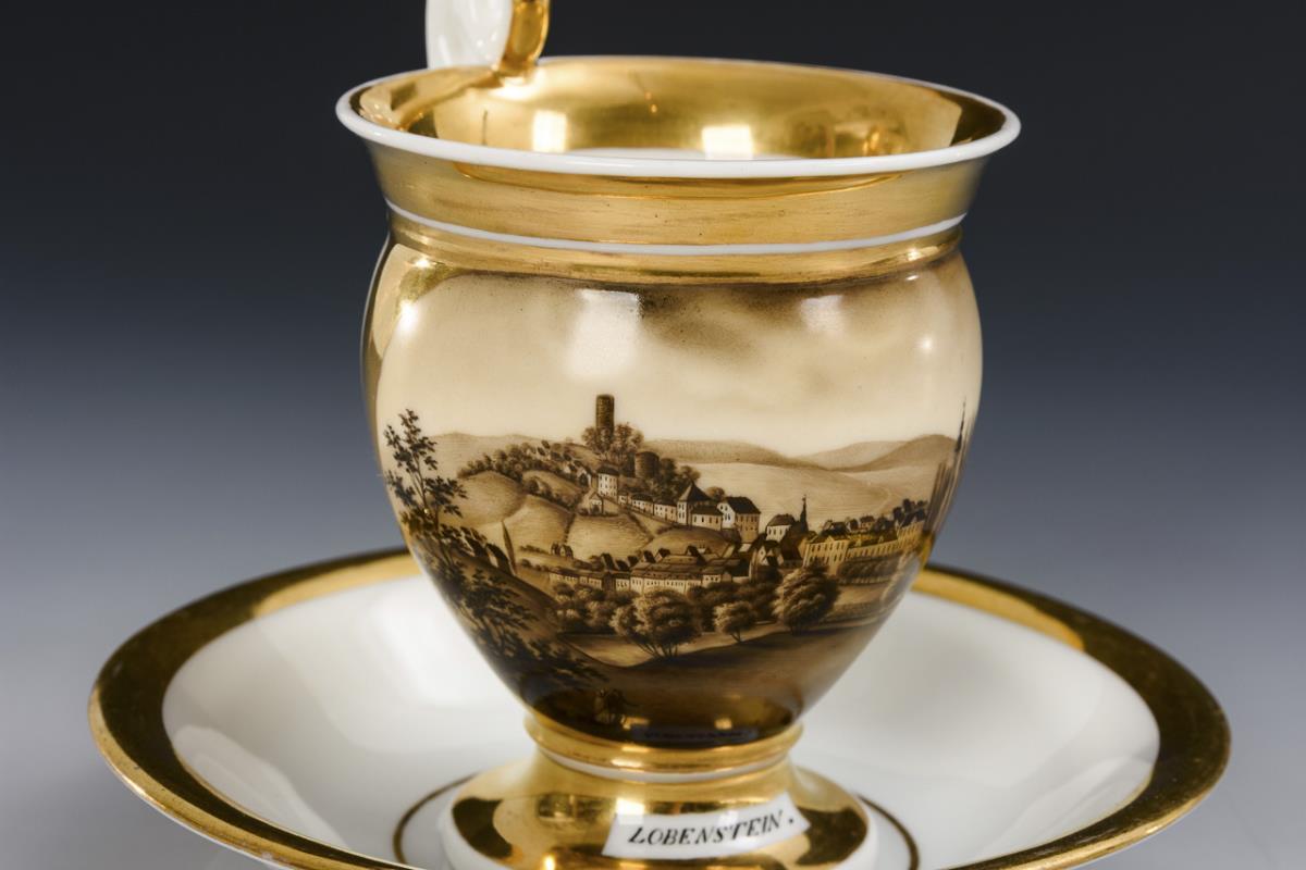 Footed bell-shaped cup with griffin-head handle. On the front a gold-framed rectangular cartouche with a sepia-painted view of Bad Lobenstein with a view of the castle ruins.