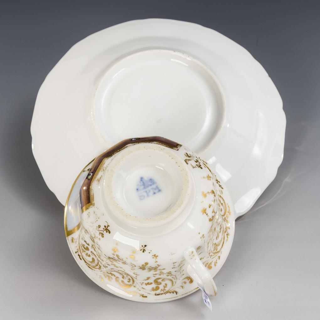 Polychrome painted, decorated in gold. Cup (h 6.5 cm), completed saucer (Ø 15 cm).