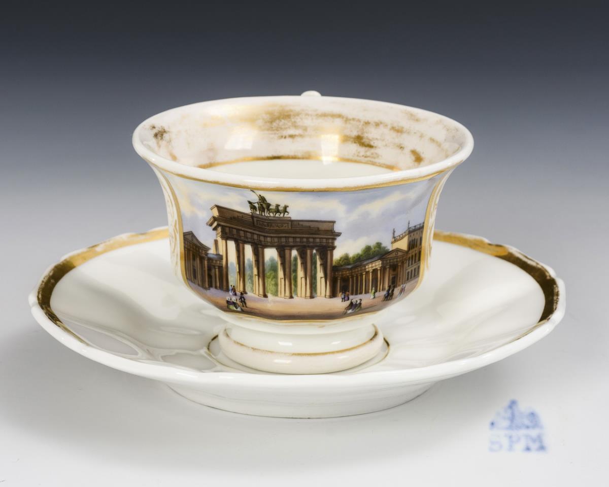 Footed, polygonal bell-shaped cup with tapering handle. On the front a gold-framed rectangular cartouche with the inscribed view of the Brandenburg Gate in Berlin. Gold rubbed.