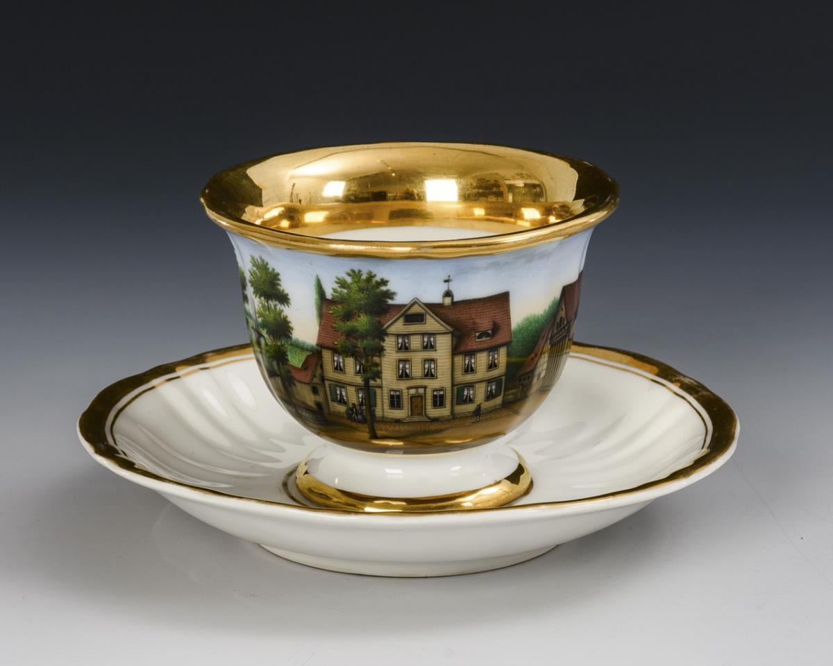 Polychrome painted, decorated in gold. Cup (h 7.5 cm), original saucer (Ø 15.5 cm).
