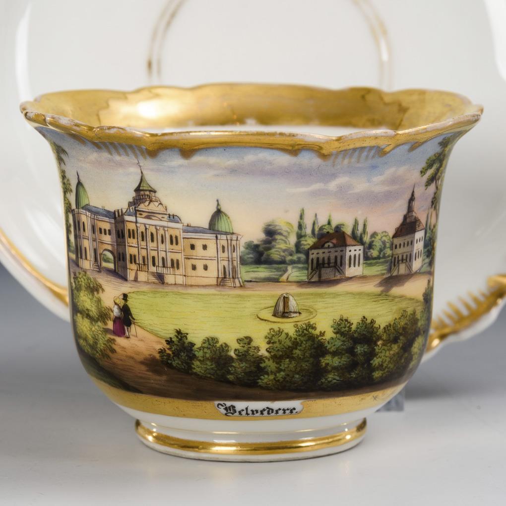 Footed bell-shaped cup with rocaille rim and handle. On the front a gold-framed rectangular cartouche with a view of Belvedere Palace in Weimar. Minimal gold abrasion.