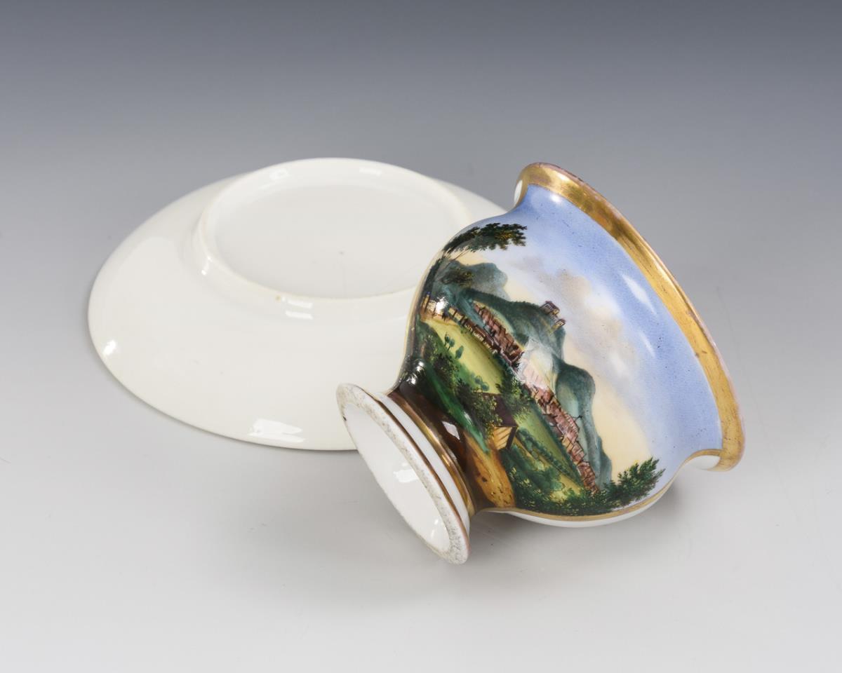 Footed bell-shaped cup with rolled handle. On the front a gold-framed rectangular cartouche with the view of the city of Eisenach. Gold partly rubbed.