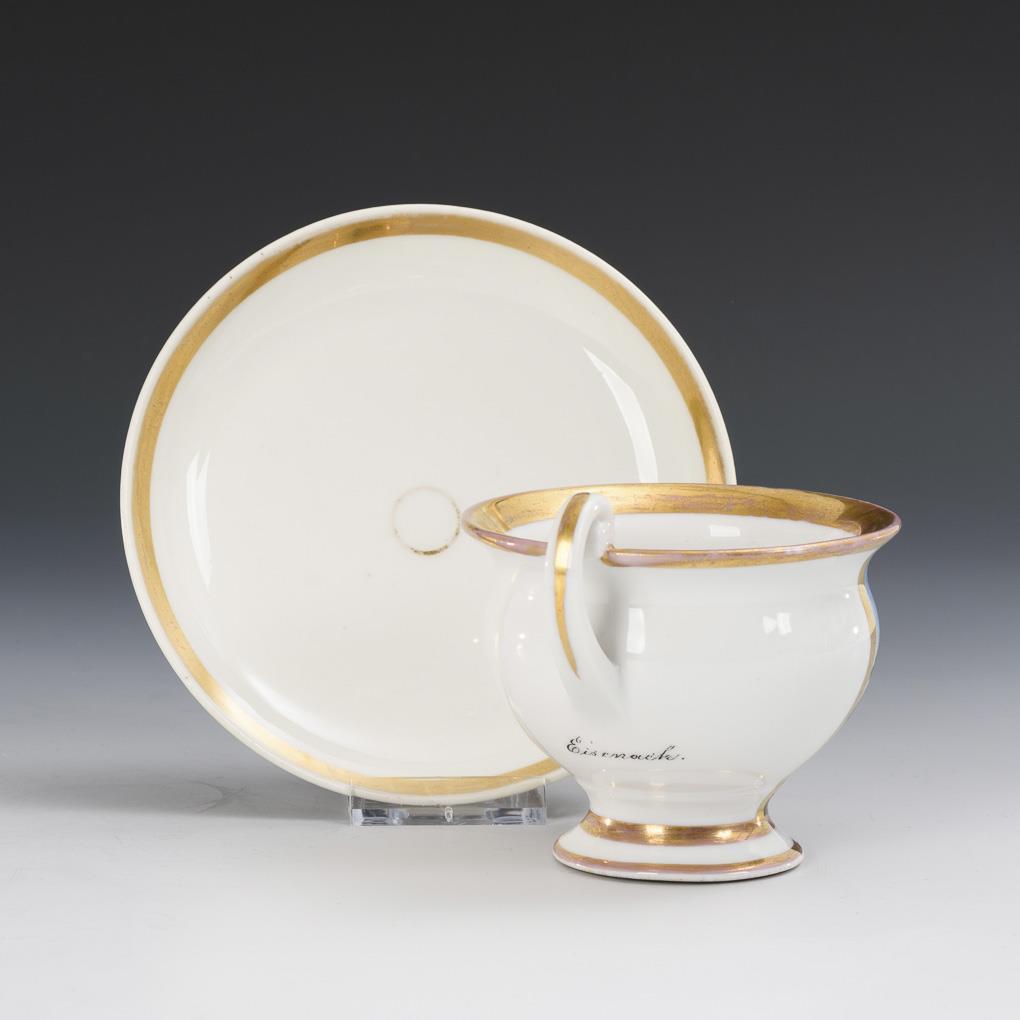 Polychrome painted, decorated in gold. Cup (h 8 cm), completed saucer (Ø 13 cm).