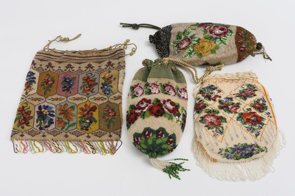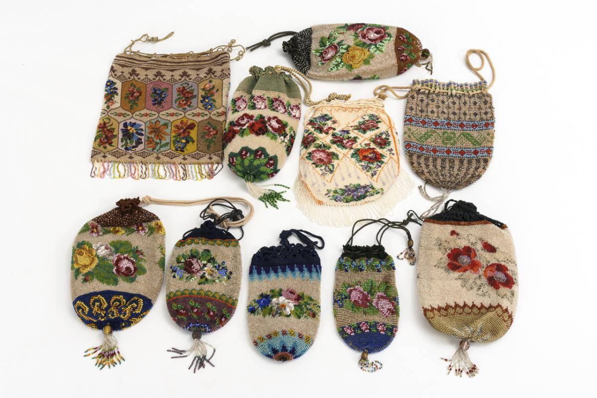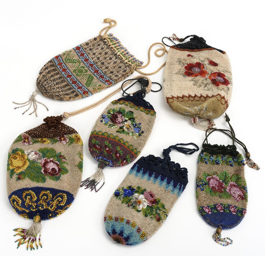 8 beaded pouches with floral embroidery, crocheted edge and ribbon closure. 2 pouches with extremely fine glass beads embroidered on both sides with roses in a diamond pattern and various flowers in ornamental cartouches.