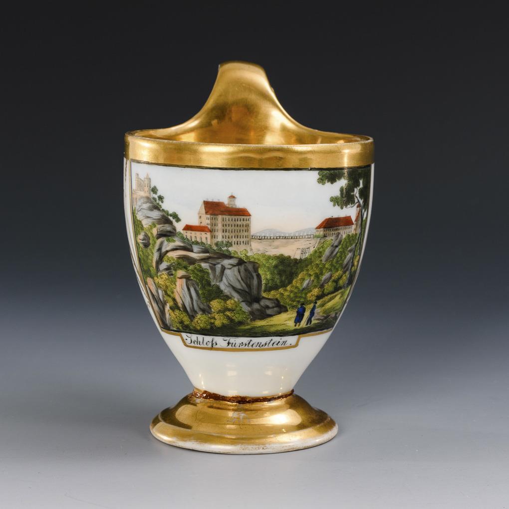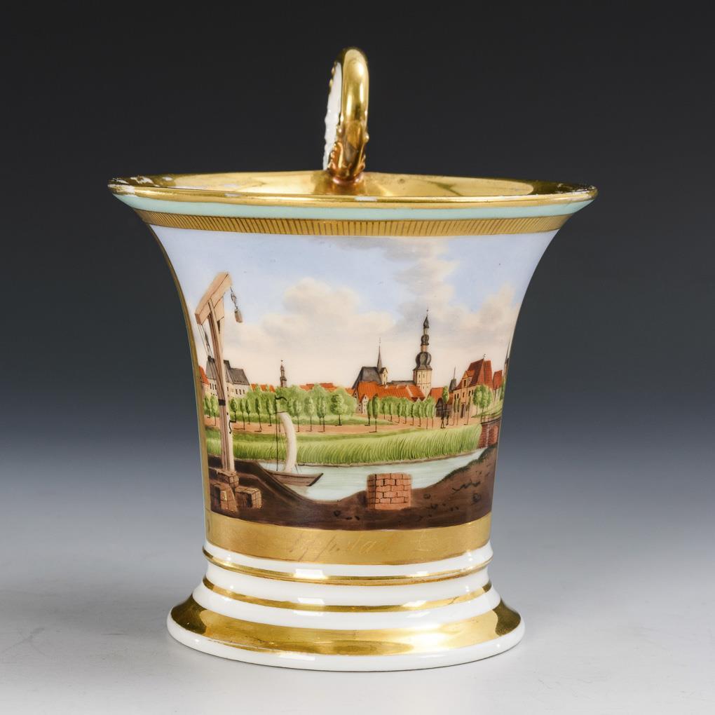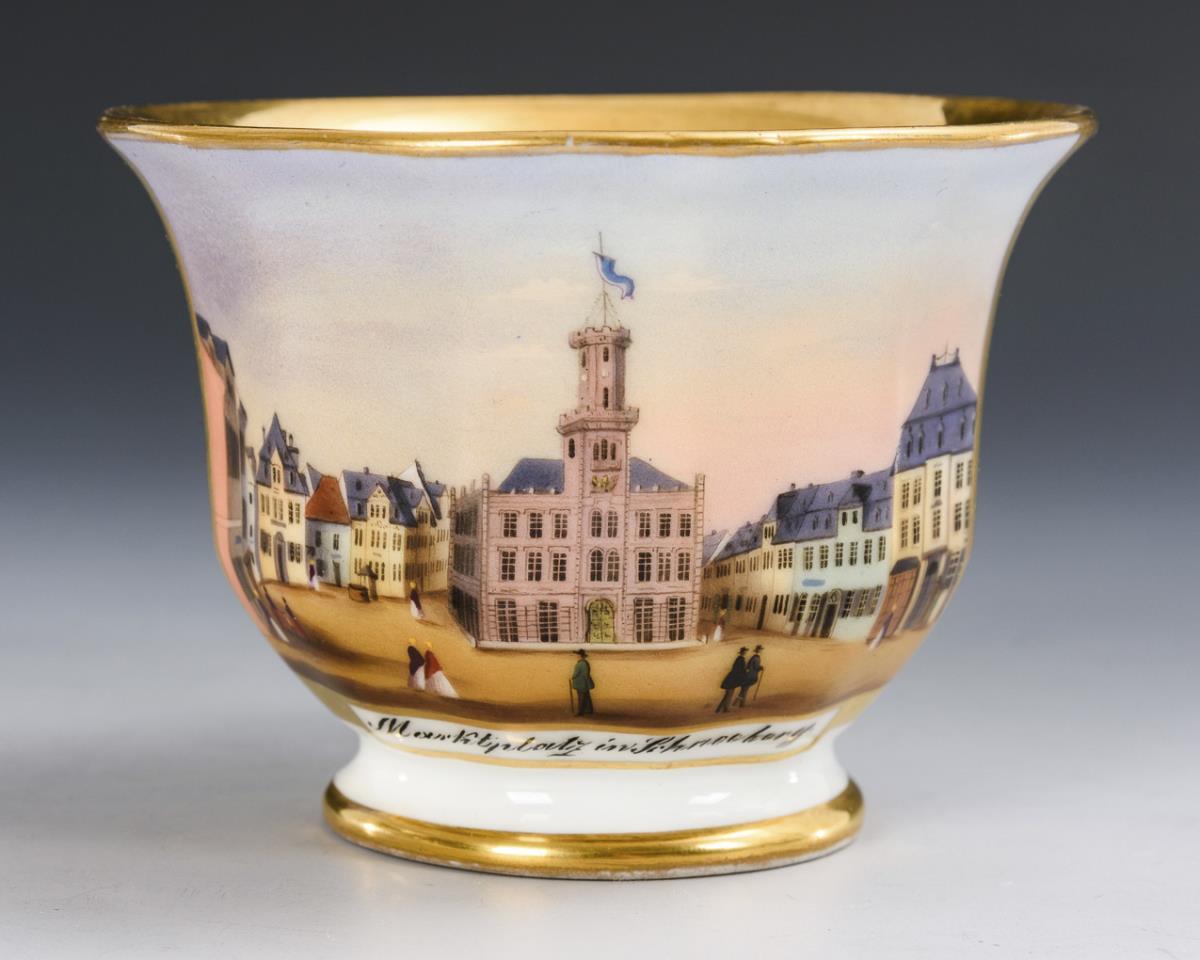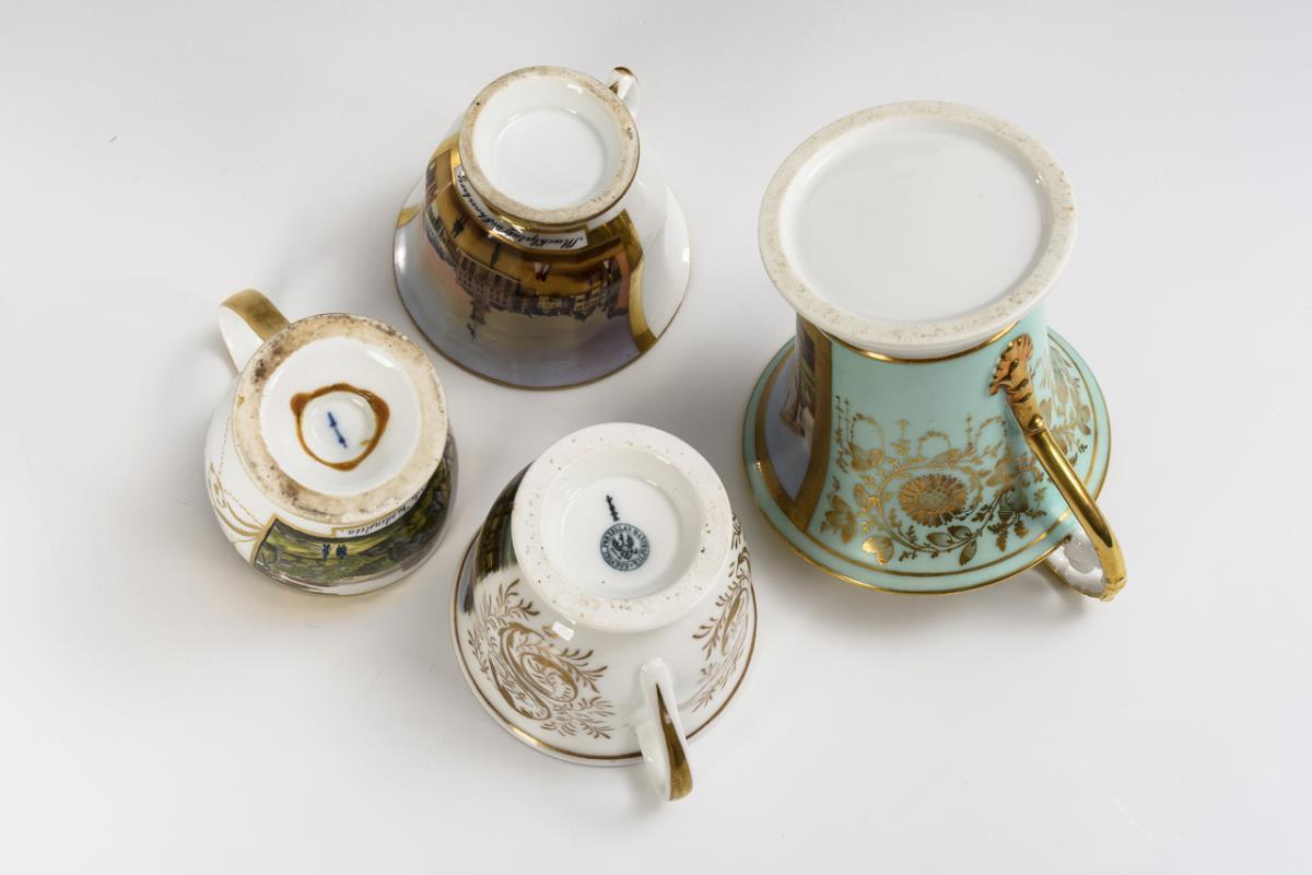 2x KPM Berlin: 1x with a view of Fürstenberg and 1x with a view of a street / 2x unmarked: 1x with a view of Lippstadt and 1x with a view of Schneeberg. Partial gold wear, with defects.