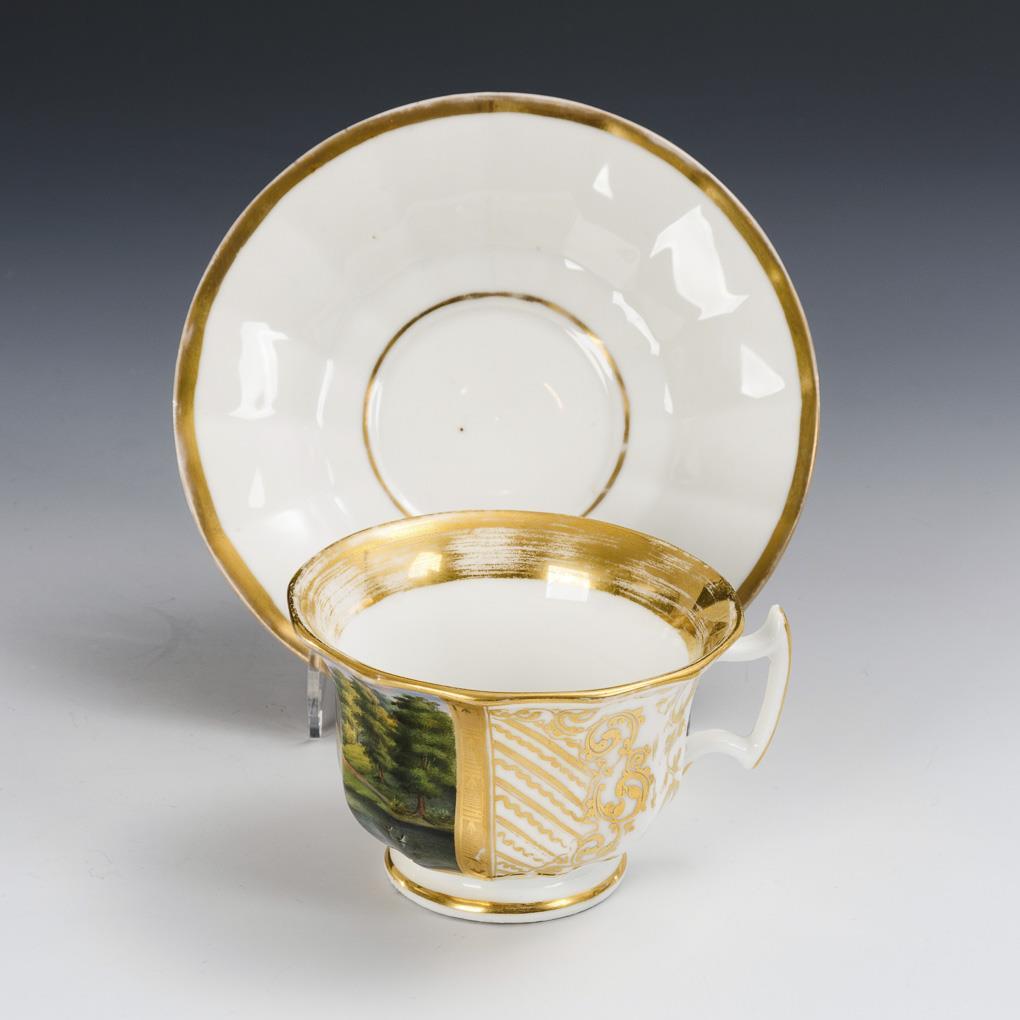 Polychrome painted, decorated in gold. Cup (h 6.5 cm), completed saucer (Ø 15 cm).