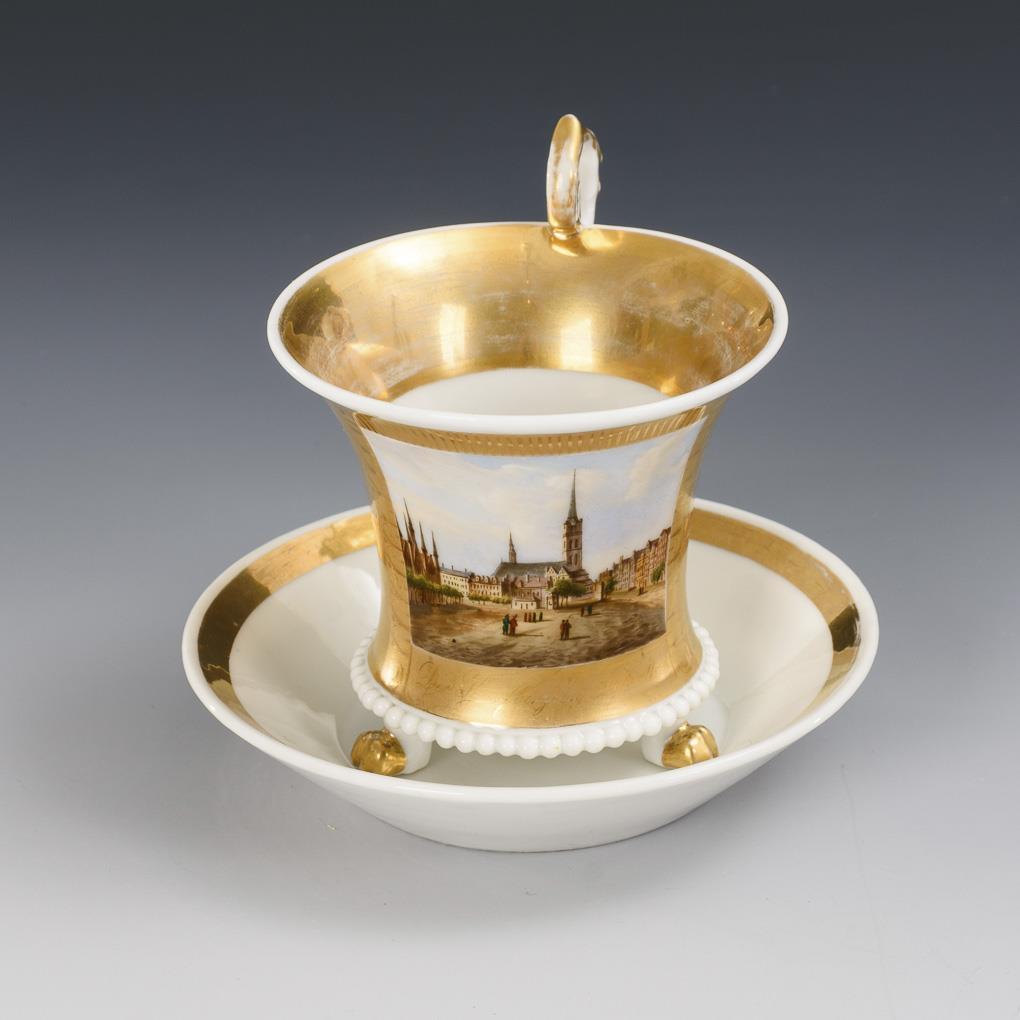 Cratered cup with pearl band, rosette handle and three paw feet. On the front a gold-framed rectangular cartouche with the inscribed view of the Koberges (= Kaufberg) in the north of Lübeck's old town island, verso gold fond. Gold rubbed.