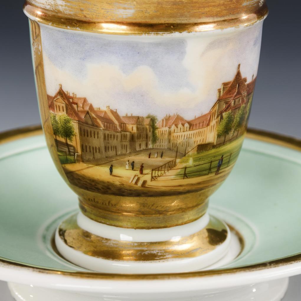 Footed bell-shaped cup with rosette handle. Turquoise background, on the front a gold-framed rectangular cartouche with inscribed view of "Calenbergstraße in Hannover". Gold rubbed, hairline crack on the saucer rim and on the rim of the cup.