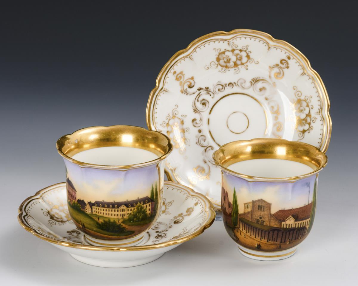 Bell-shaped cups with multi-passed rim and leaf handle. Each with a gold-framed medallion on the front with a view of the Kurhaus in Lippspringe and the Arminiusbad in Lippspringe inscribed on the underside, verso with vegetal gold painting. Minimal gold wear.