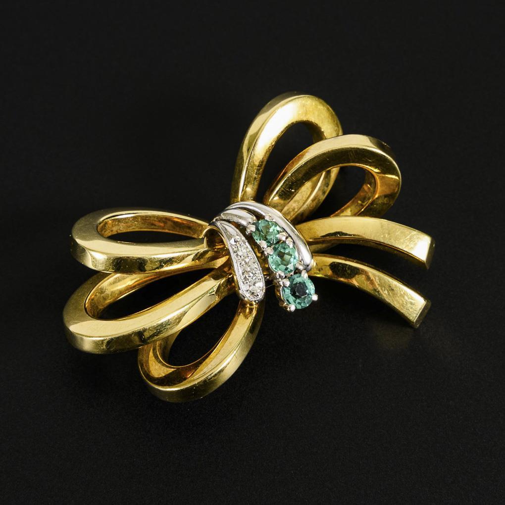 Sculpturally designed brooch with 3 chaton-set tourmalines and 3 set diamonds. Sliding hook.