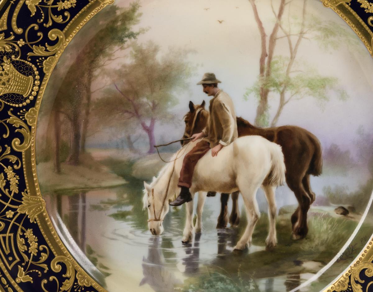1x signed "P.V.": cobalt blue flag with ornamental relief gold painting, in the mirror the depiction of a farmer watering his two horses by the river. / 1x signed "C. May": white flag background with splendid, ornamental relief gold painting, in the mirror the depiction of three cows by the river.